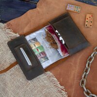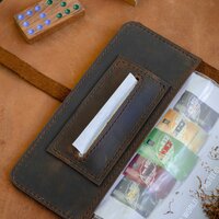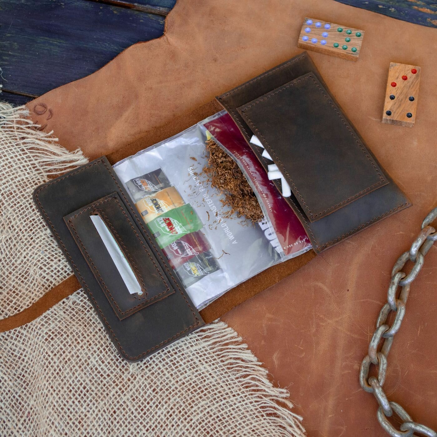 Кожаный кисет для табака. Подходит для стандартных упаковок табака. Можно удобно разместить фильтры и бумагу. Закрывается на хлястик. Отсек для табака закрывается плотно, что предотвращает высыхание и выпадание табака из кисета.