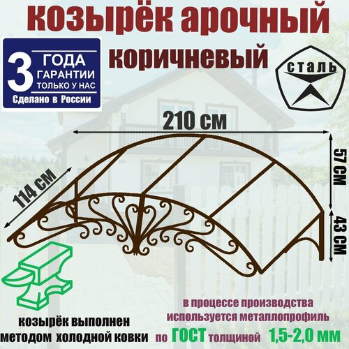 Козырёк над дверью - это защита от дождя и снега, Ширина козырька 210см. Основание козырька изготовлено из металлического профиля 20х20х1,5мм. Рисунок выполнен методом холодной ковки из трубы 15х15х1,5мм. Конструкция окрашена атмосфероустойчивой порошковой краской в 3 слоя. Качество изделия обеспечивает устойчивость к ветру, дождю и снегу, обеспечивая 100% функциональность и практичность. Легкая установка важно! Каркас продаётся без поликарбоната и подходит под любой тип покрытия.