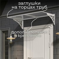 Каркас покрытия изготовлен из стальной трубы квадратного сечения 15х15мм, все открытые торцы труб защищены пластиковыми заглушками. Изящные и прочные кронштейны - из 1,5мм стали. Лаконичный и, в то же время, оригинальный орнамент на них сделан с помощью лазерной резки. Покрытие козырька – сотовый поликарбонат толщиной - 4мм. Ячеистые торцы поликарбоната закрыты торцевыми П-образными профилями, что защищает ячейки от попадания влаги. Место примыкания козырька к стене закрывается металлическим уголком-отливом. Отметим также о дополнительном креплении, которое можно установить в центре козырька снизу. Все металлические элементы имеют высококачественную порошковую окраску. Таким образом козырек максимально защищен от атмосферных воздействий и коррозии.