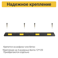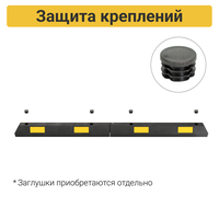 Для удобства хранения, транспортировки и монтажа, колесоотбойник выполнен в виде двух одинаковых частей, собирающихся вместе в процессе монтажа на объекте. Колесоотбойник оснащен четырьмя отверстиями для крепления его к поверхности при помощи анкерных болтов. При необходимости, крепежные отверстия могут быть защищены специальными заглушками.