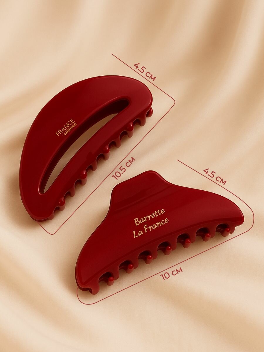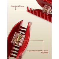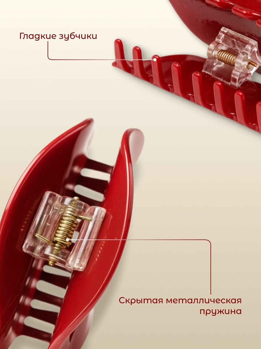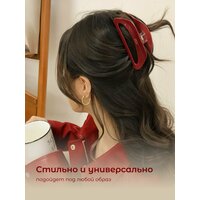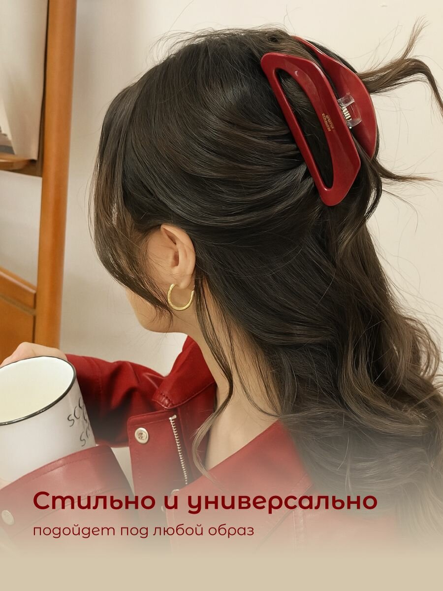 Универсальный дизайн и глубокий красный цвет заколки легко сочетаются с любым стилем одежды — от делового до повседневного. Он отлично заменит несколько мелких аксессуаров и подойдет тем, кто ищет один удобный и красивый аксессуар на каждый день. Особенно хорошо большой крабик для средних и густых волос смотрится в сочетании с другими акцентами из набора похожих украшений на тон ниже или выше того же оттенка.