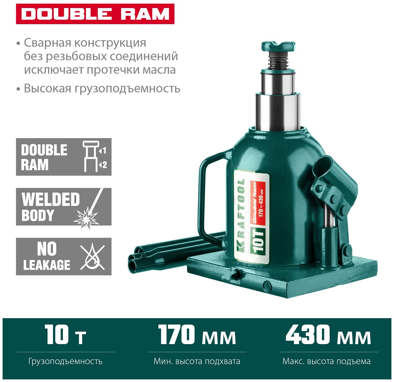 Купить KRAFTOOL DOUBLE RAM, 10т, 170-430 мм, Двухштоковый бутылочный домкрат с увеличенным подъемом (43463-10) с доставкой по всей России.
