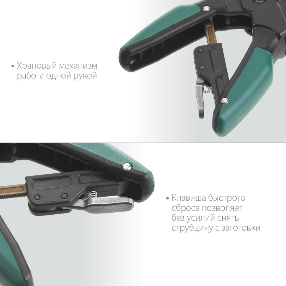 Преимущества струбцины KRAFTOOL: Устойчивость к коррозии Небольшой вес - 290 грамм Быстрый зажим заготовок Плавная регулировка силы сжатия Корпус армированный фиберглассом Эффект рычага обеспечивает многократное увеличение прижимной силы Храповый механизм позволяет работать одной рукой Клавиша быстрого сброса для снятия струбцины с заготовки без лишних усилий Подвижные губки с V-образными выемками - для фиксации заготовок сложной формы Пластиковые накладки предотвращают повреждение поверхностей