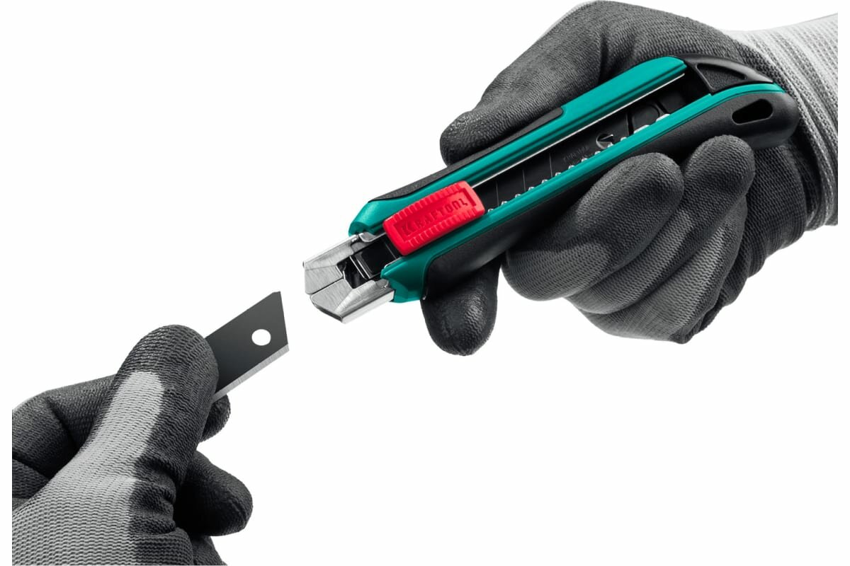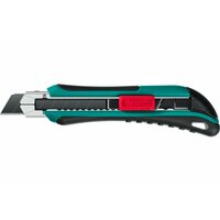 Инструмент прост в использовании - имеется надежный фиксатор и простая система отламывания лезвия. Рельефная рукоять не скользит в ладони.