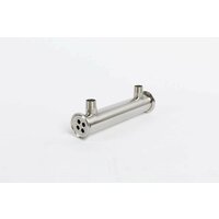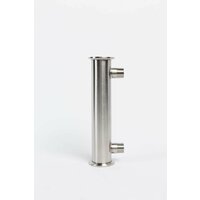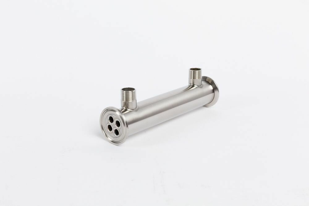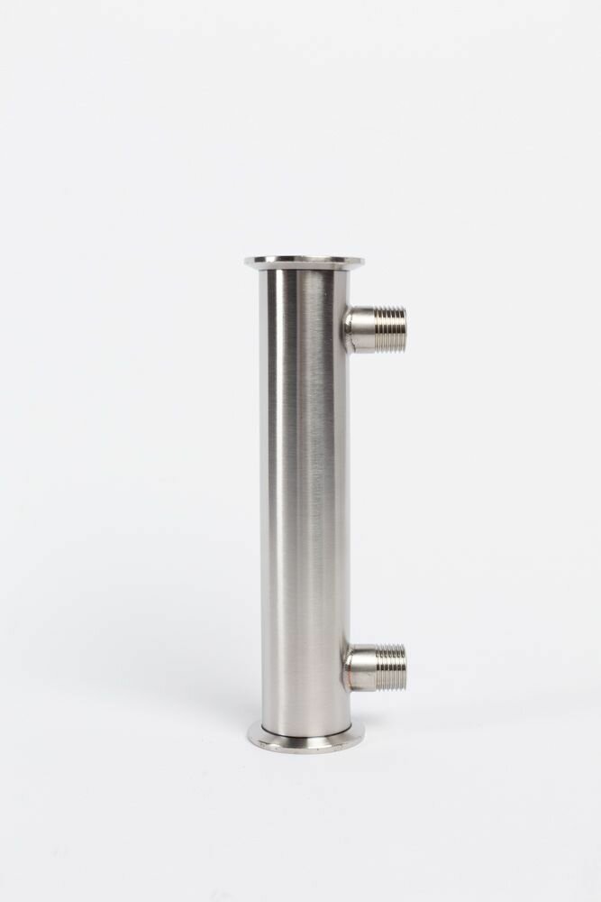 Дефлегматор кожухотрубный 1,5 дюйма изготовлен из пищевой нержавеющей стали AISI 304 представляет собой цилиндр, в котором находятся трубки, пропускающие пар. Подключается между перегонным кубом и холодильником, для промежуточной конденсации паров спирта и возвращения флегмы на дополнительную очистку. Позволяет повысить крепость дистиллята. Дефлегматор изготовлен из трубы 38 мм, внутри которой находиться обойма из 4 трубок диаметром 10 мм, 3 перегородки для лучшего охлаждения пара. Для подключения к аппарату используются кламповые соединения диаметром 1,5 дюйма. Подключение к воде осуществляется через резьбовое соединение 1/2 дюйма.