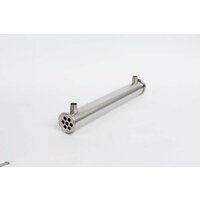 Кожухотрубный холодильник проточного типа изготовлен из пищевой нержавеющей стали AISI 304, представляет собой цилиндр, в котором находятся трубки, пропускающие пар. Холодильник кожухотрубный предназначен для конденсации спиртосодержащих паров в дистиллят, а также охлаждение полученной жидкости. Приставляет собой корпус из трубы 50,8 мм внутри которой находиться обойма из 7 трубок диаметром 12мм, 5 перегородок для лучшего охлаждения пара. Для подключения к аппарату используются кламповые соединения диаметром 2,0 дюйма. Подключение к воде осуществляется через резьбовое соединение 1/2 дюйма.