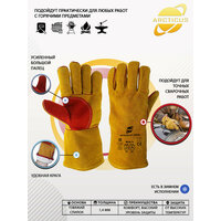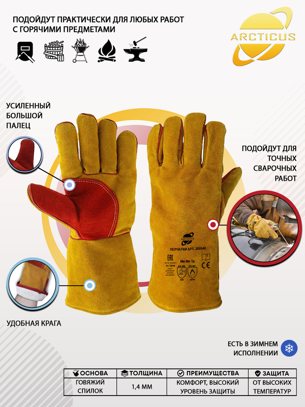 Arcticus 200540 - краги сварщика пятипалые с дополнительным усилением ладони и большого пальца. Изготовлены из бычьего спилка толщиной 1,2 - 1,4 мм класса А желтого цвета, прошиты кевларовой нитью. Двойные швы. Длина 35 см. Подкладка: в кистевой части выполнена из флиса, в краге из хлопчатобумажной ткани. Сертификация: ТР ТС 019/2011; EN 420; EN 388 (4243); EN 407 (42314X)
