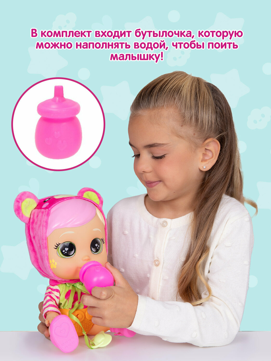Познакомься с куколками Край Бебис — милыми девочками, которые раньше жили в мире Волшебных Слёз, а теперь пришли в реальный мир, чтобы отправиться… в детский сад! Сэм готова к приключениям в детском саду! Она обожает, когда с ней играют, одевают, а еще больше, когда обнимают. Но не стоит расстраивать обворожительную малышку! Она начнет плакать настоящими слезами, если ты заберешь у нее пустышку. Обними и положи ее на спинку или дай пустышку - и Сэм снова станет счастливой! У Сэм есть капюшон с медвежьими ушками, съемный подгузник, ботиночки, бутылочка и, конечно же, любимая пустышка. Она двигает ручками, ножками и головой — играть с ней одно удовольствие! Дай ей пустышку - успокой малышку! Кукла Сэм Daycare плачущая интерактивная Cry Babies высотой 30,5 см с аксессуарами. Материалы: полимерные материалы, текстильное волокно (полиэстер), элементы из металла. Товар сертифицирован и безопасен для детского использования. Для работы игрушки требуются 2 щелочные батарейки типа ААА на 1,5В (в комплекте демонстрационные батарейки). Упаковка: открытая коробка.