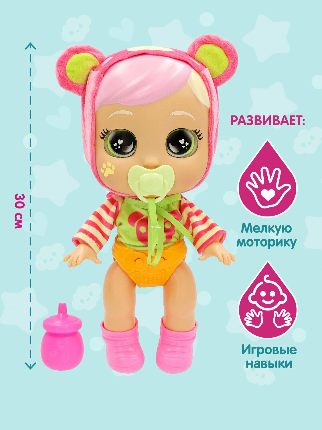 бутылочка, подгузник, пустышка, капюшон с медвежьими ушками, съёмные ботиночки