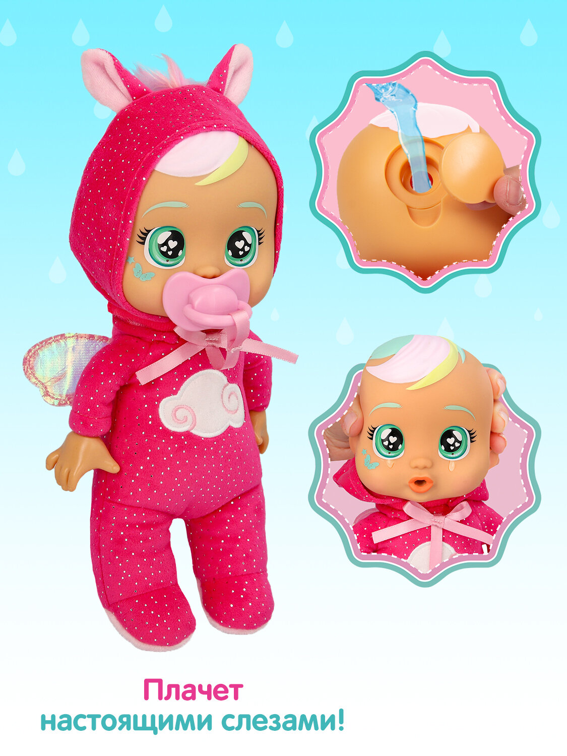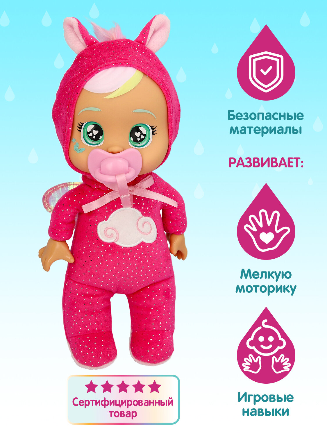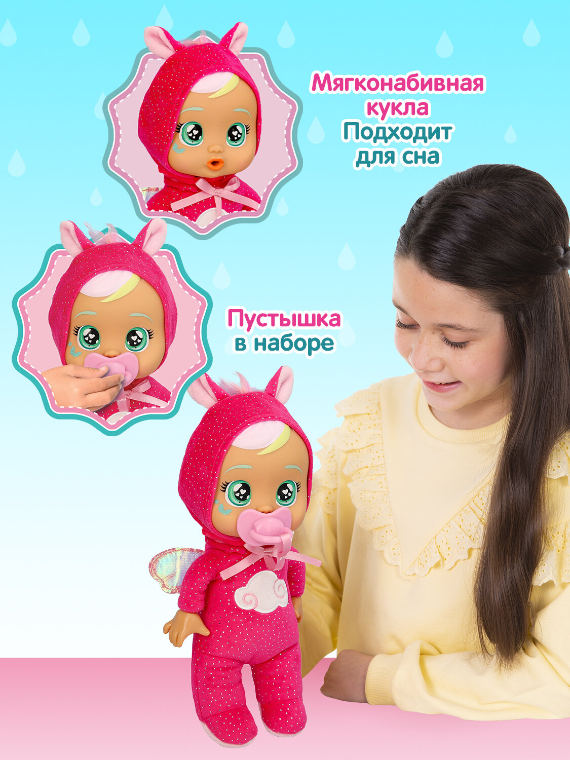 Твои любимые куклы Край Бебис в мягком формате! Где же малышки Край Бебис оказались теперь? В реальном мире! Теперь перед ними невероятный и огромный окружающий мир! Какие приключения их ожидают? Очень интересно! Малышка Ханна - любознательная путешественница, нуждается в твоей заботе! Она обожает, когда с ней играют и когда её обнимают. Возьми ее с собой на прогулку, чтобы она не грустила! Положи Ханну в свой рюкзак и играй с ней в любом месте! Но не стоит расстраивать обворожительную малышку! Если нажать на ее голову, она начнет плакать настоящими слезами. Обними Ханну и дай пустышку или расскажи ей веселую историю, и Малышка снова станет счастливой! Ханна очень понимающая: она постоянно заботится о своих друзьях и хочет, чтобы они все время были счастливы. Ханна умеет летать, но пока ее навыки далеки от идеала, она постоянно теряется в полете или не может найти дорогу до дома. Обаятельная Ханна носит с собой пустышку, сочетающуюся с ее модной пижамой яркого единорога. Кукла Ханна Малышка DAY CARE плачущая Cry Babies высотой 25 см с мягконабивным телом и пустышкой, закрепленной к пижамке. Для того чтобы слезы вытекали из глаз при нажатии на голову, необходимо залить воду в специальный отсек на голове куклы и вынуть пустышку. Материалы: полимерные материалы, текстильное волокно (полиэстер), элементы из металла. Товар сертифицирован и безопасен для детского использования. Упаковка: бирка.