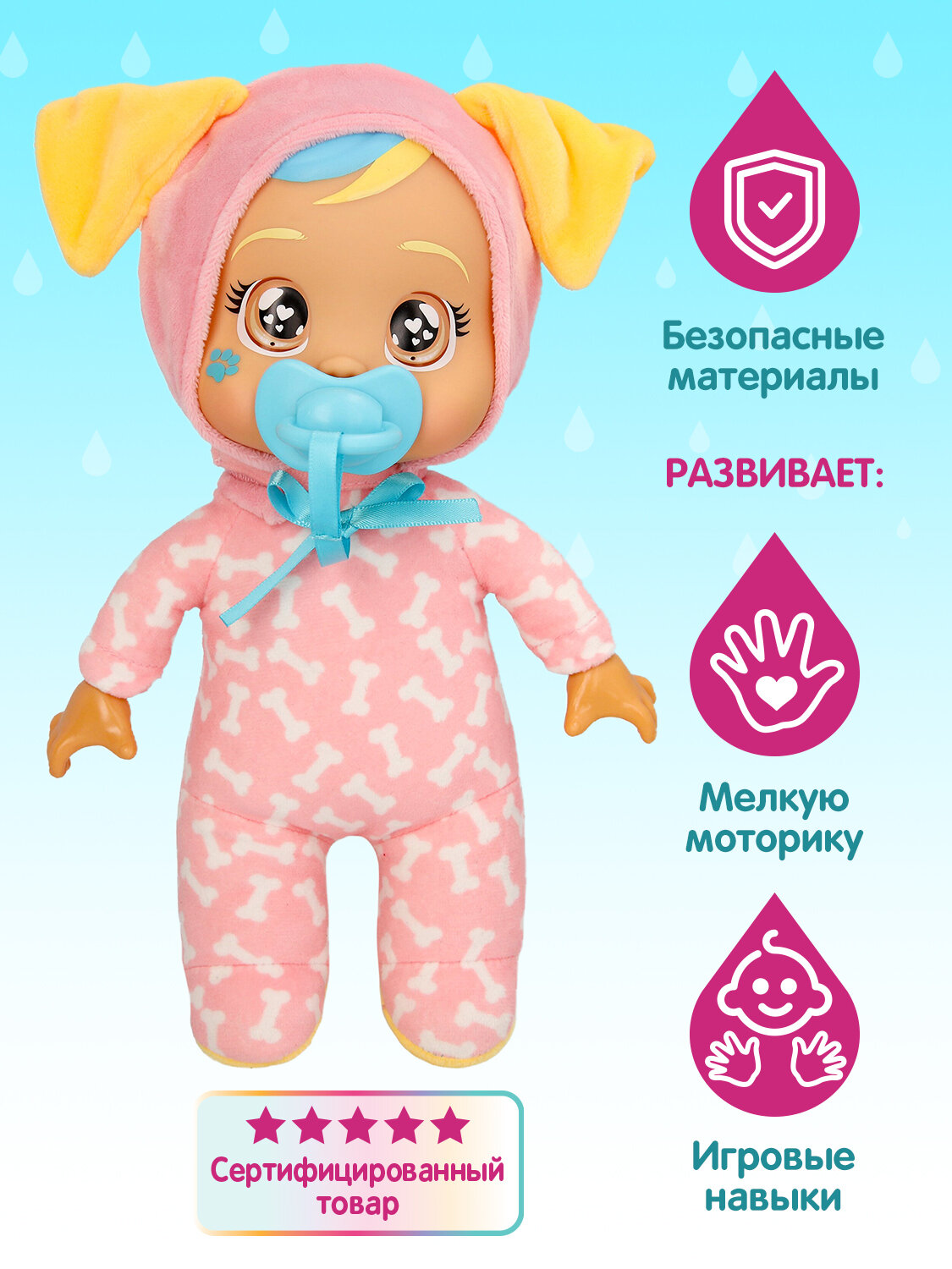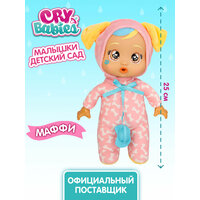 Твои любимые куклы Край Бебис в мягком формате! Где же малышки Край Бебис оказались теперь? В реальном мире! Теперь перед ними невероятный и огромный окружающий мир! Малышка Маффи - активная и любознательная малышка! У нее мягкое плюшевое тело, которое идеально подходит для того, чтобы обниматься и играть. Она носит милую пижамку собачки и яркую пустышку. Малышку удобно брать с собой куда угодно! Если нажать на ее голову, она начнет плакать настоящими слезами. Обними Маффи и дай ей пустышку или расскажи веселую историю, и она снова станет счастливой! Cry Babies поможет научиться заботиться о других и делиться любовью! Кукла Маффи Малышка DAY CARE плачущая Cry Babies высотой 25 см с мягконабивным телом и пустышкой, закрепленной к пижамке. Для того чтобы слезы вытекали из глаз при нажатии на голову, необходимо залить воду в специальный отсек на голове куклы и вынуть пустышку. Материалы: полимерные материалы, текстильное волокно (полиэстер), элементы из металла. Товар сертифицирован и безопасен для детского использования. Упаковка: бирка. Кукла не имеет подарочной упаковки, поставляется в логистической коробке для сохранения товарного вида.