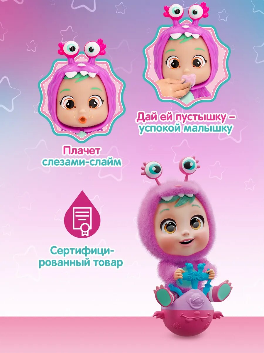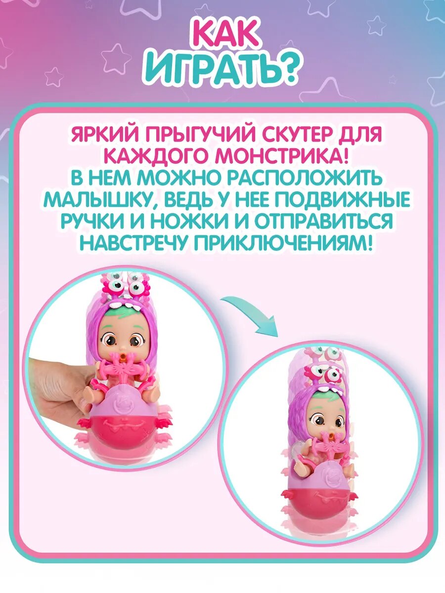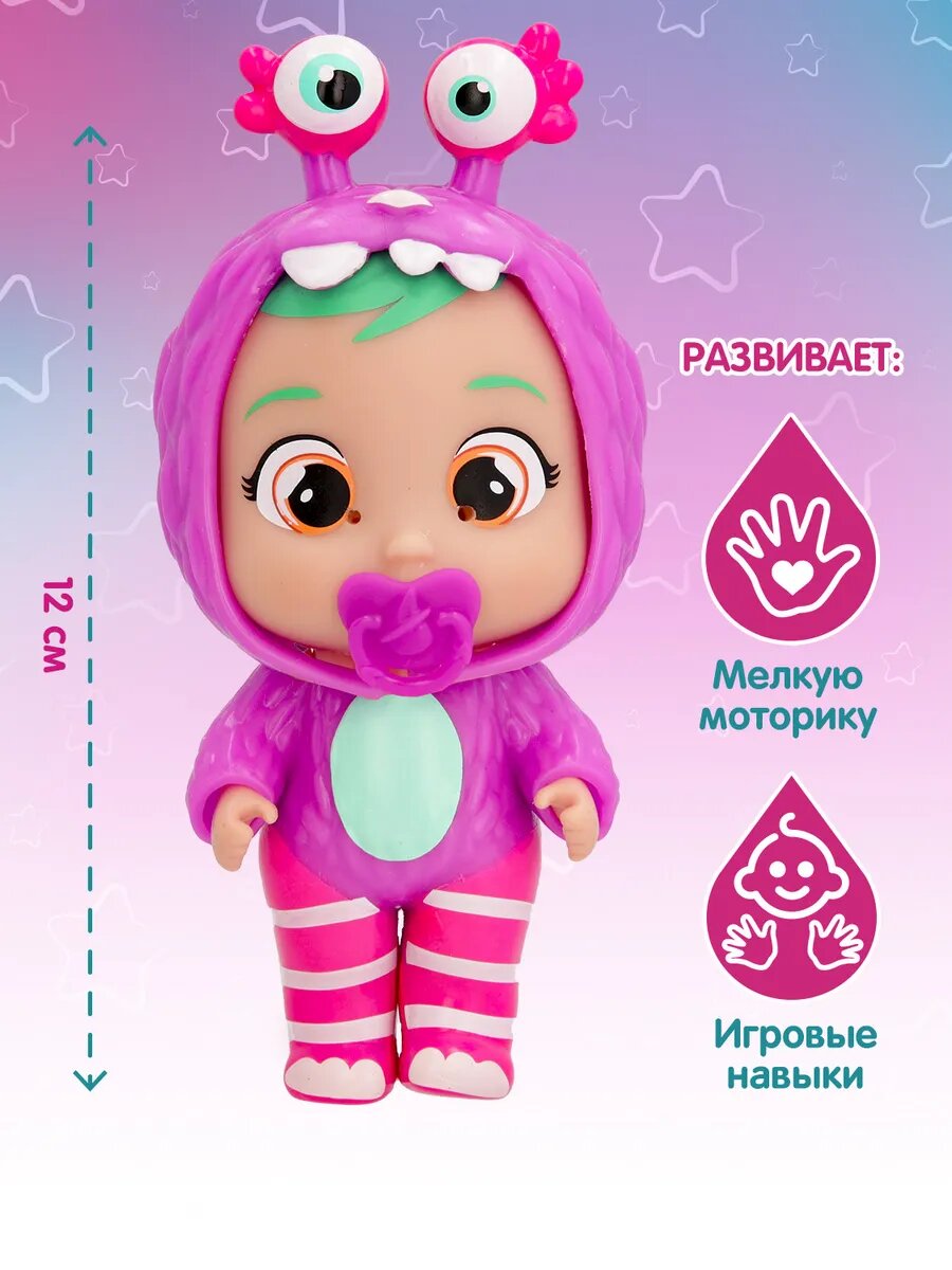 Любимые герои популярного мультсериала Край Бебис в мини-формате! Край Бебис - милые девочки, которые живут в мире Волшебных Слез. Кто эти очаровательные монстрики? Это же жители Планеты Слезок! Откройте для себя новых персонажей Край Бейбис. Малышка Бубу готова познакомить вас со своей необыкновенной планетой на своем прыгающем скутере! У нее стильный силиконовый костюмчик, который можно снять, и 5 дополнительных аксессуаров для еще более увлекательной игры. Собирай друзей и вместе отправляйтесь в Звездное путешествие! Если нажать на ее голову, малышка начнет плакать необычными слезами в виде слайма! Успокой Бубу и дай ей пустышку, она снова станет веселой! Милая команда монстриков, всегда готова к игре на своих прыгающих скутерах! В коллекции 6 малышей, собери их всех! В наборе кукла высотой 13,5 см с подвижными ручками и ножками, транспортное средство и множество модных аксессуаров. Для того чтобы слезы вытекали из глаз при нажатии на голову, необходимо залить воду в специальный отсек на голове куклы, подождать 2 минуты и вынуть пустышку. Материалы: полимерные материалы. Товар сертифицирован и безопасен для детского использования. Упаковка: блистерная упаковка (11 х 8 х 18 см).