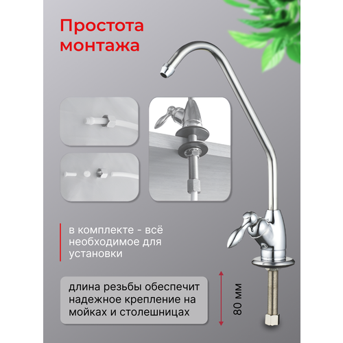 Этот отдельно стоящий кран предназначен для подачи чистой питьевой воды от фильтров, установленных под кухонной мойкой. Модель "Капелька" №3 с длиной резьбовой части (ножкой) 80 мм – оптимальный выбор для моек и столешниц стандартной толщины.