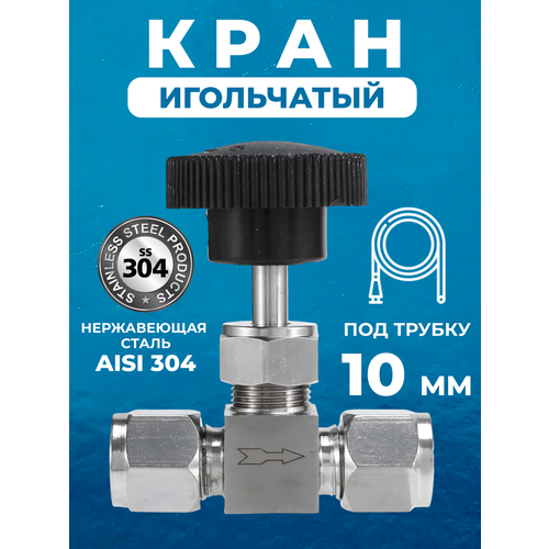 Кран игольчатый под трубку, нержавеющая сталь, прямой, 10 мм