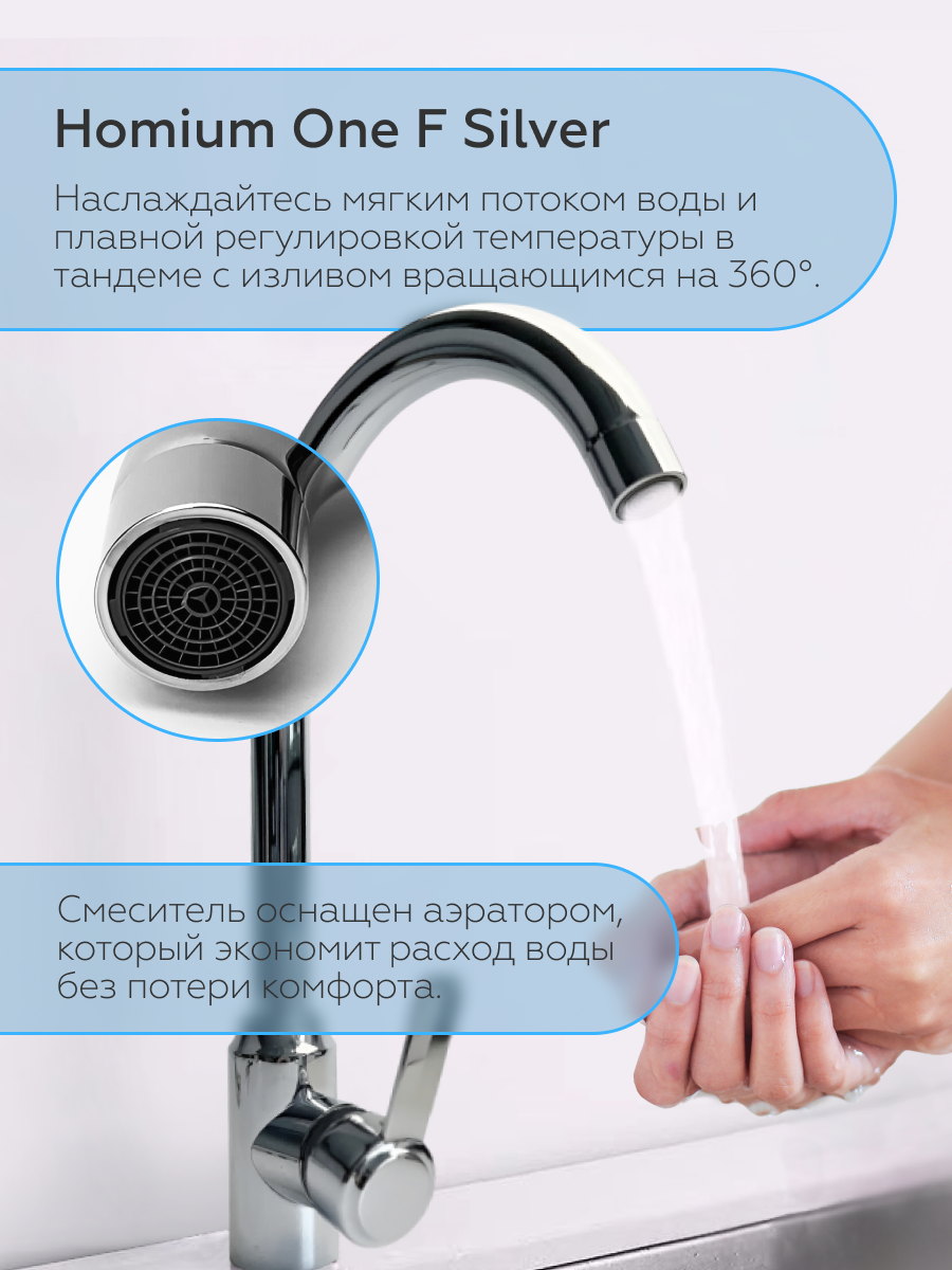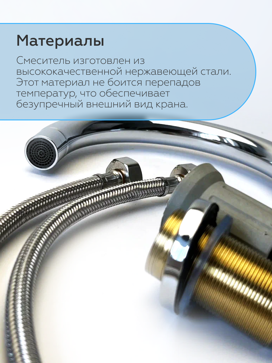 | Комплектация | Смеситель серебристый для кухни, аэратор, гибкая подводка, крепления |