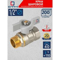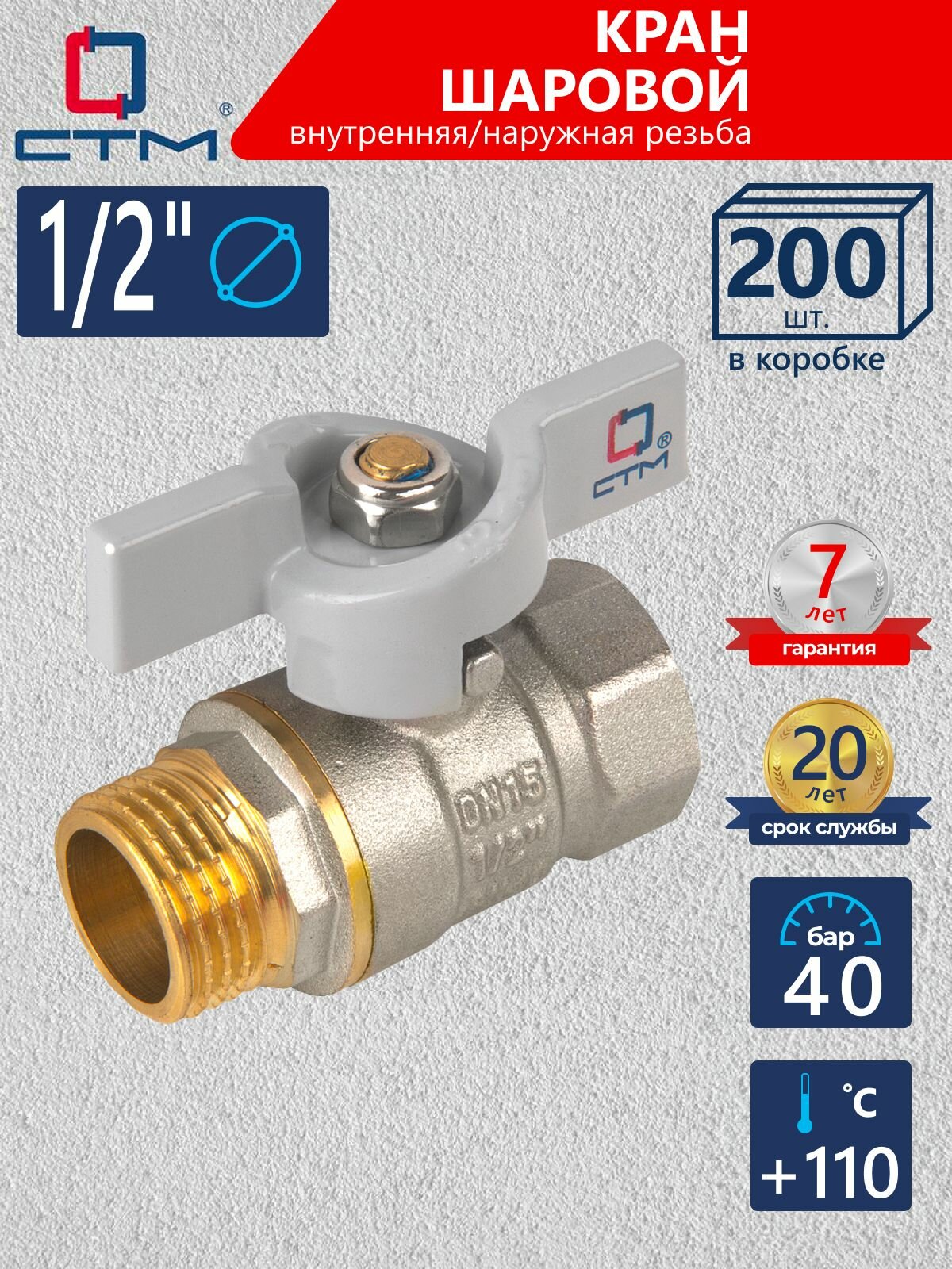 Кран шаровой для воды 1/2" набор 200 шт. CTM стандарт с нутренней/наружной резьбой, ручкой-бабочкой применяется в качестве запорной арматуры на трубопроводах систем питьевого, хозяйственно-бытового и промышленного назначения, систем холодного, горячего водоснабжения и отопления, сжатого воздуха и жидких углеводородах, а также трубопроводах, транспортирующих среды, не агрессивные к материалам крана. Особенности конструкции, технологии изготовления, применяемых материалов обеспечивают долголетнюю работу шарового крана СТМ стандарт при эксплуатации в условиях отечественных инженерных систем. Шаровой кран СТМ стандарт является неполнопроходным и ремонтопригодным. Корпус и шток крана изготовлен из высококачественной горячепрессованной латуни с никелированным покрытием. Шаровой затвор изготовлен из высококачественной горячепрессованной латуни отполирован и покрыт хромом. Герметичность затвора крана соответствует наиболее высоком классу по госту 9544-2005 – А. Наличие тефлоновых седельных колец и сальниковой прокладки позволяет использовать шаровой кран СТМ стандарт в отопительных системах с рабочей температурой до 110ºС. Оптимальная длина резьбы обеспечивает надёжное соединение. Техническое обслуживание крана в течение всего срока эксплуатации не требуется (средний срок службы – 20 лет, средний ресурс наработки на отказ – 35000 циклов).