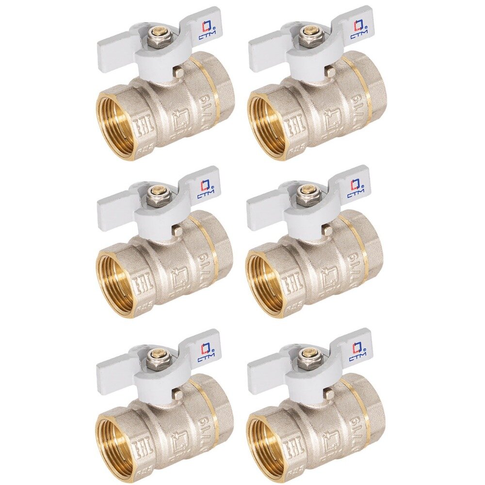 Кран шаровой для воды 1/2" набор 6 шт. CTM стандарт с внутренней резьбой, ручкой-бабочкой применяется в качестве запорной арматуры на трубопроводах систем питьевого, хозяйственно-бытового и промышленного назначения, систем холодного, горячего водоснабжения и отопления, сжатого воздуха и жидких углеводородах, а также трубопроводах, транспортирующих среды, не агрессивные к материалам крана. Особенности конструкции, технологии изготовления, применяемых материалов обеспечивают долголетнюю работу шарового крана СТМ стандарт при эксплуатации в условиях отечественных инженерных систем. Шаровой кран СТМ стандарт является неполнопроходным и ремонтопригодным. Корпус и шток крана изготовлен из высококачественной горячепрессованной латуни с никелированным покрытием. Шаровой затвор изготовлен из высококачественной горячепрессованной латуни отполирован и покрыт хромом. Герметичность затвора крана соответствует наиболее высоком классу по госту 9544-2005 – А. Наличие тефлоновых седельных колец и сальниковой прокладки позволяет использовать шаровой кран СТМ стандарт в отопительных системах с рабочей температурой до 110ºС. Оптимальная длина резьбы обеспечивает надёжное соединение. Техническое обслуживание крана в течение всего срока эксплуатации не требуется (средний срок службы – 20 лет, средний ресурс наработки на отказ – 35000 циклов).