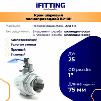 Кран шаровый 1 из нержавейки востребованы в трубопроводах, к которым применяются высокие требования по эстетичности, устойчивости к коррозии. Шаровые краны (шаровый кран 1 дюйм) устанавливают в бытовых водопроводных и газовых сетях, на предприятиях сферы фармакологии, пищевой, нефтегазовой промышленности, в коммуникациях с агрессивными жидкостями, на объектах, где требуется повышенная герметичность и антикоррозионность. Кран шаровой (кран 25 мм шаровый) тяжелый, толстые стенки, усиленный корпус, вес больше по сравнению с аналогичными легкими кранами. Конструкция: полнопроходной, двусоставной Тип присоединения шаровый кран 1: муфтовый Тип управления кран шаровой 1: ручное Шаровой кран размеры: 1/4", 3/8", 1/2", 3/4", 1", 1-1/4", 1-1/2", 2", 2-1/2", 3", 4" Максимальное давление кран 1 шаровый: 1/4" - 1" - 63 атм 1-1/4" - 2" - 40 атм. Рабочая температура: от -35° до +180° Максимальная температура: от -50° до +230° Класс герметичности: А