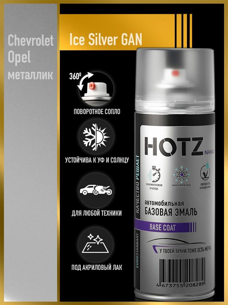 Краска аэрозольная 1K «Chevrolet / Opel Ice Silver GAN» металлик 520 мл, базовая автомобильная ремонтная эмаль, HOTZ: сравнение цен, характеристики, фото, актуальное наличие и цены.