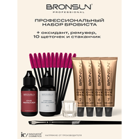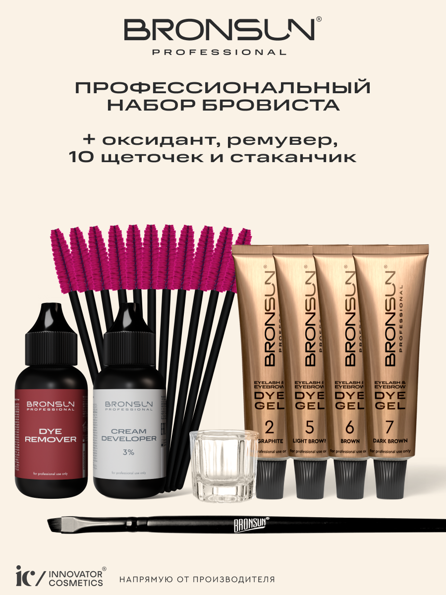 Обновленная экстрастойкая гель - краска для бровей и ресниц BRONSUN - теперь в формате профессионального набора бровиста! Четыре оттенка гель - краски с эффектом татуажа + оксидант 3%, ремувер для удаления краски с кожи и кисть в подарок!