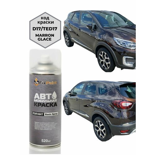 Аэрозольная краска FixPaint Spray для автомобилей RENAULT CAPTUR, KAPTUR, код краски D17, название цвета (оттенок) MARRON GLACE, MARRON CAFE Коричневый каштан, предназначена для ремонтной покраски металлических и пластиковых кузовных элементов автомобиля по технологии идентичной профессиональной и позволяет качественно выполнить восстановление лакокрасочного покрытия.