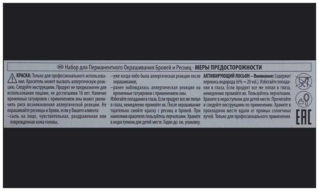 В комплекте вы найдете все необходимое для окрашивания бровей и/или ресниц: краситель (15 мл), окислитель (10 мл), емкость для разведения, палочку для смешивания и нанесения краски, а также защитные салфетки.