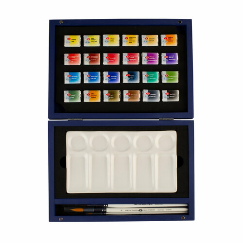 Купить Набор акварельных художественных красок «Белые Ночи» 24 цвета в кюветах 2,5 мл с фарфоровой палитрой и кистями в синем деревянном пенале с доставкой по всей России.