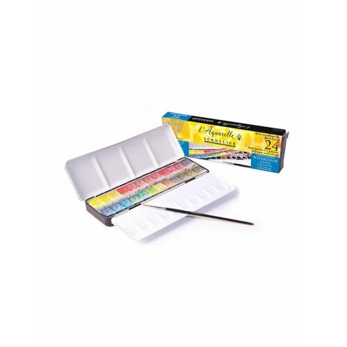N131606 Набор акварели "Artists" в полукюветах, 24 цвета, 1 кисть, металл. Акварель на медовой основе. Краски акварельные для рисования Sennelier славятся своим высоким качеством и высокой концентрацией пигментов, что повышает их светостойкость. В набор входит: 1 кисть, краски 24 цвета (лимонный жёлтый, индийский жёлтый, неаполитанская жёлтая темная, киноварь французская, ярко-красный, венецианский красный, ализарин, карминовый, хинакридон красный, розовый, кобальт фиолетовый светлый, диоксазин пурпурный, ультрамарин темный, голубая ФЦ, лесной зелёный, изумрудный, зелёный светлый ФЦ, охра жёлтая, сиена жжёная, серая Пейна, сепия, умбра натуральная, кость жжёная). Хранить при температуре от +5 до +25 С˚.