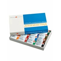 состав набора: кадмий лимонный, кадмий желтый средний, сиена натуральная, золотистая, кадмий оранжевый, сиена жженая, алая, краплак красный светлый, фиолетовая, ультрамарин, кобальт синий, желто-зеленая, зеленая, умбра, умбра жженая, нейтрально-черная. Упаковка - картонная коробка 12 х 8,5 х 1,5 см, форма выпуска: кювета