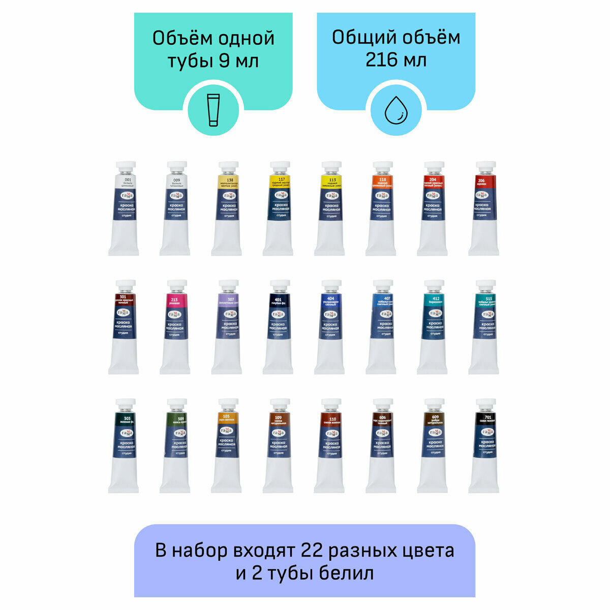 Масляные краски гамма серии «Студия» идеальны для начинающих художников и студентов художественных училищ. Они не уступают тонкотёртым масляным краскам по степени перетира, пастозности и светостойкости. Краски экологически безопасны благодаря имитациям кадмиево-кобальтовой группы пигментов. В набор входят 22 разных цвета и 2 тубы белил. Объём одной тубы — 9 мл.