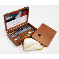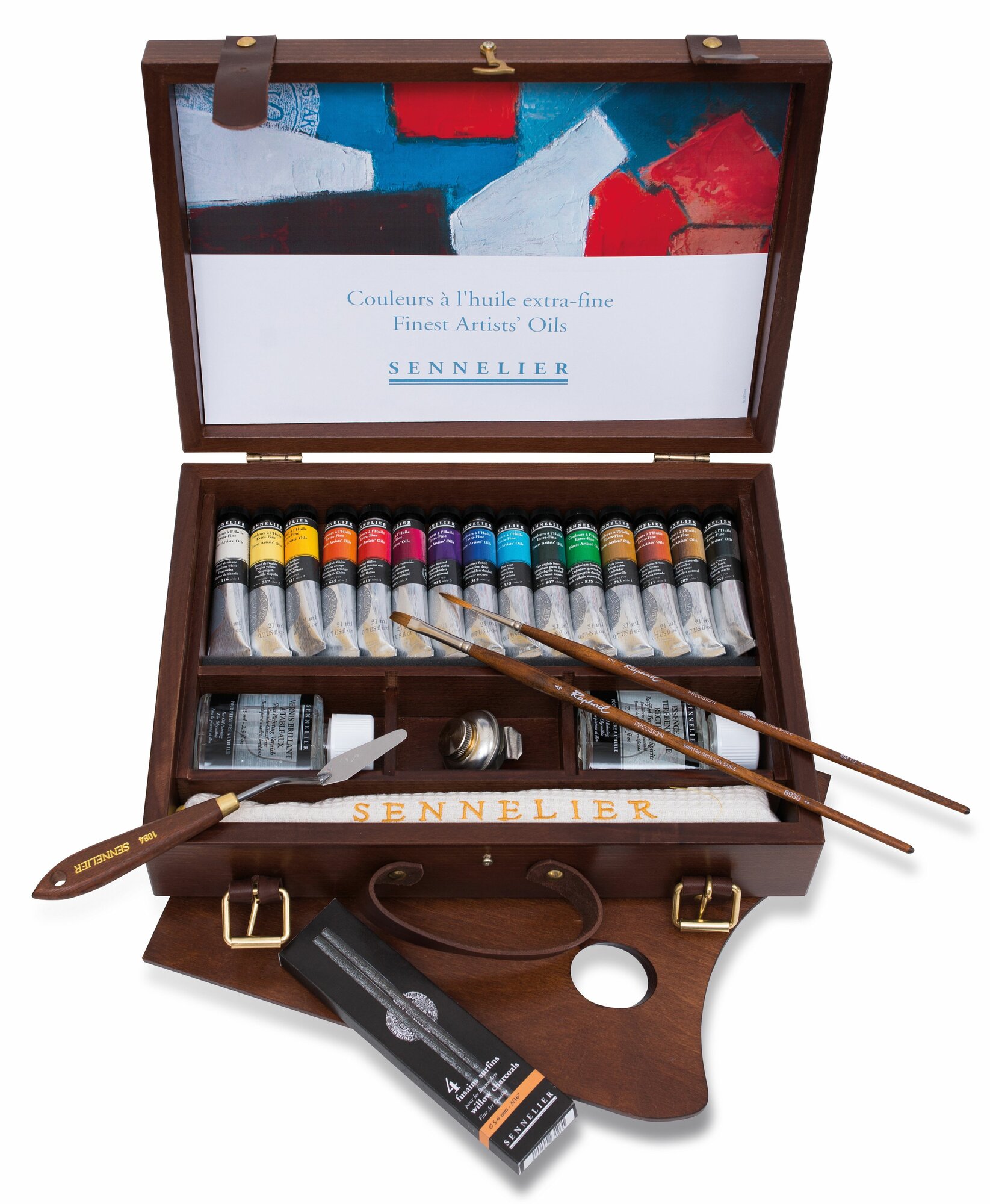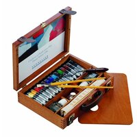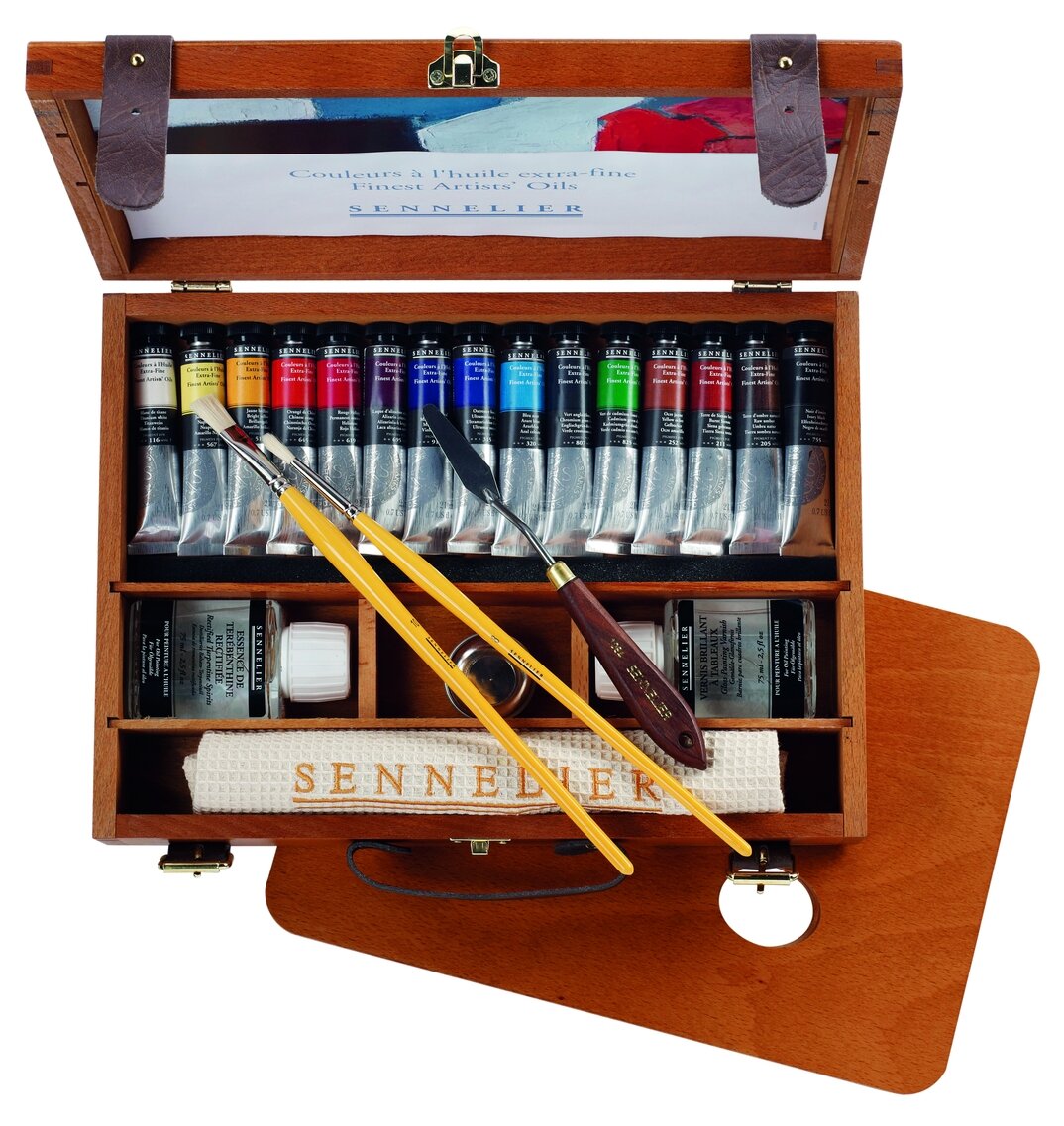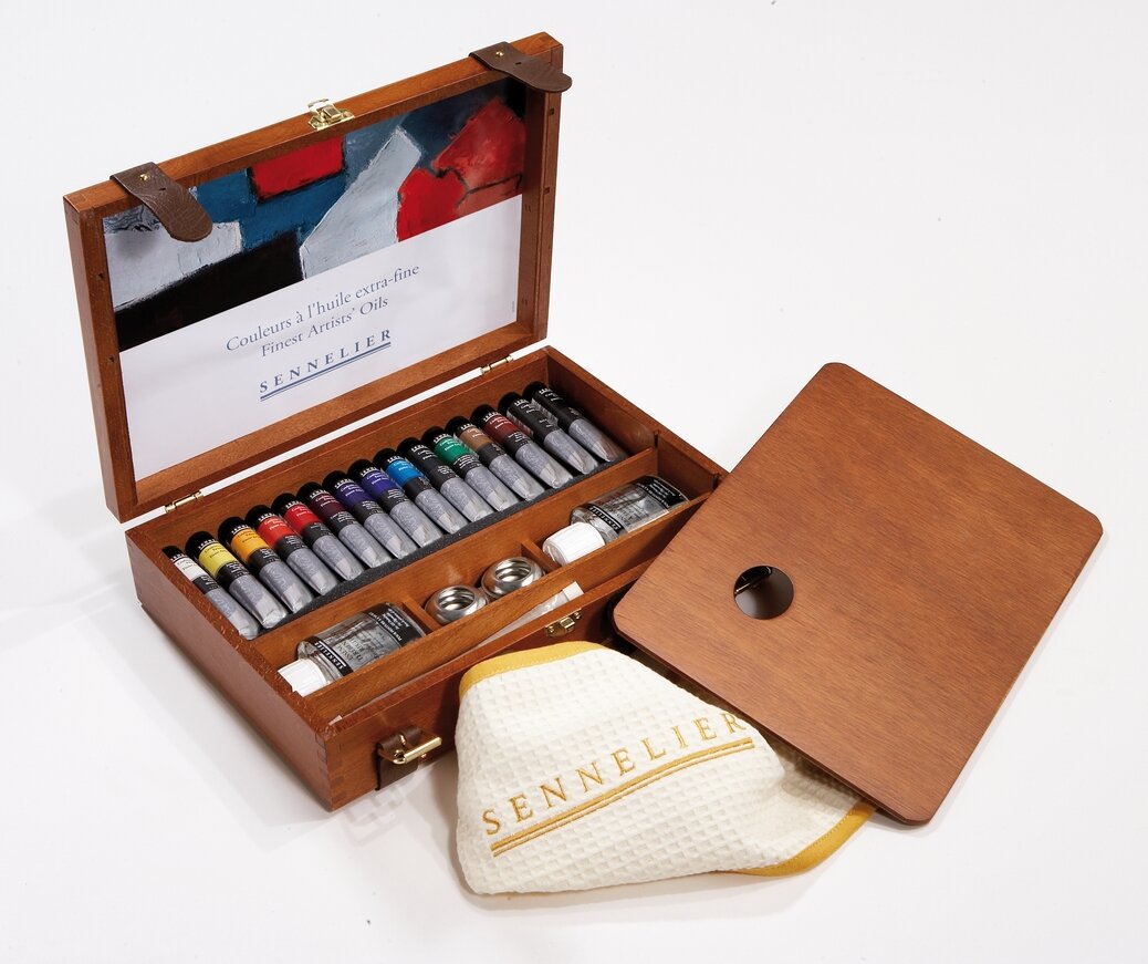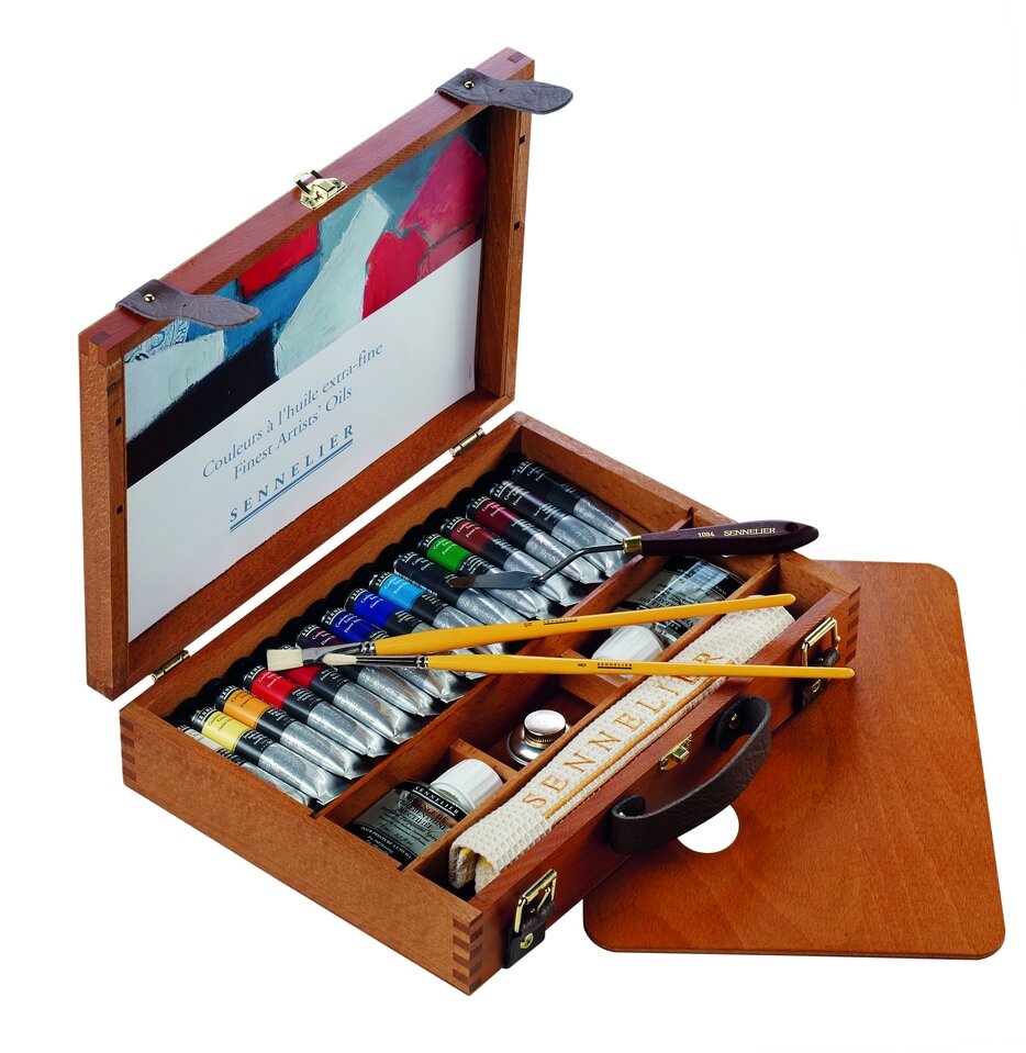 N130355.00 Набор масляных красок Sennelier «Artists», 15 цветов в тубах 21 мл, аксессуары, в деревянной коробке. Компактный подарочный набор выполнен в виде чемоданчика из темного дерева с удобной кожаной ручкой для переноски и с кожаными ремешками для дополнительной фиксации. Состав набора: 15 цветов масляных красок «Artists» («Sennelier») в тубе 21 мл: белила титановые № 116, неаполитанская жёлтая № 567, яркая жёлтая № 511, китайская оранжевая № 645, красная интенсивная прочная № 619, ализарин малиновый № 695, фиолетовая марганциевая № 915, ультрамарин темный № 315, лазурный голубой № 320, хром зелёный темный № 807, кадмий зелёный темный № 825, охра жёлтая № 252, сиена жжёная № 211, умбра натуральная № 205, кость жжёная № 755, 1 банка 75мл терпентина очищенного (скипидара), 1 банка 75 мл глянцевого лака для масляных красок, 1 мастихин для рисования, 1 Кисть «Raphael» плоская для акрила и масла 8930 № 4, 1 Кисть «Raphael» для тонкой подводки, для акрила и масла 8910 № 2, 1 уголь «Sennelier», 1 двойная металлическая масленка, 1 вафельное белое полотенце с надписью «Sennelier», 1 деревянная прямоугольная съемная палитра, таблица цветов масляных красок. После вскрытия упаковки срок годности может изменяться в зависимости от способа использования и хранения. Производитель: Max Sauer s.a.s, Франция
