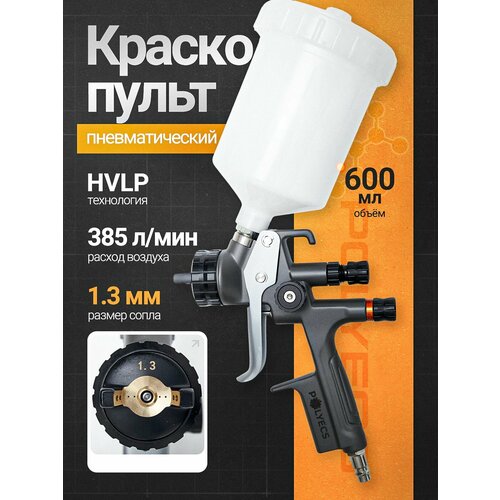 Краскопульт для компрессора Polyecs HVLP имеет высокопроизводительную универсальную воздушную голову, облегченный корпус из кованного алюминия.