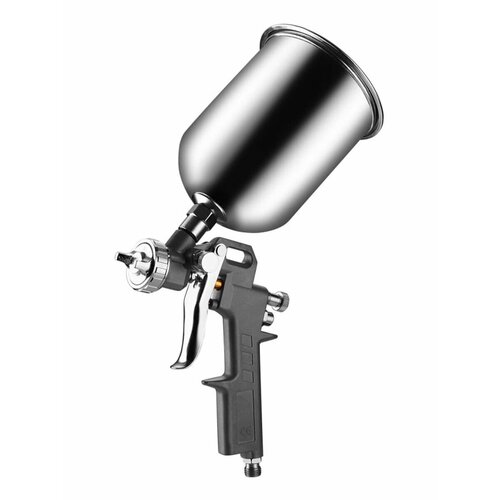 Краскопульт оснащен верхним бачком объемом 1000 мл, что позволяет работать без перерыва на дозаправку. Бачок изготовлен из алюминия, что обеспечивает его долговечность и устойчивость к коррозии.