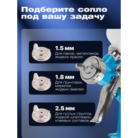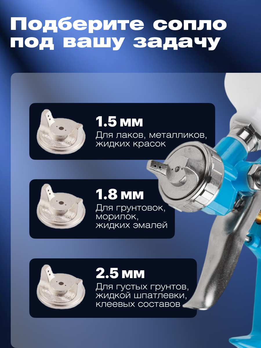 - Диаметр сопла: 1.4 мм (в комплекте дополнительные сопла: 1.5 мм, 1.8 мм, 2.5 мм).
