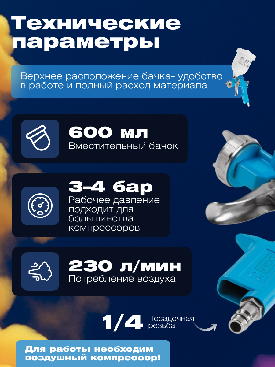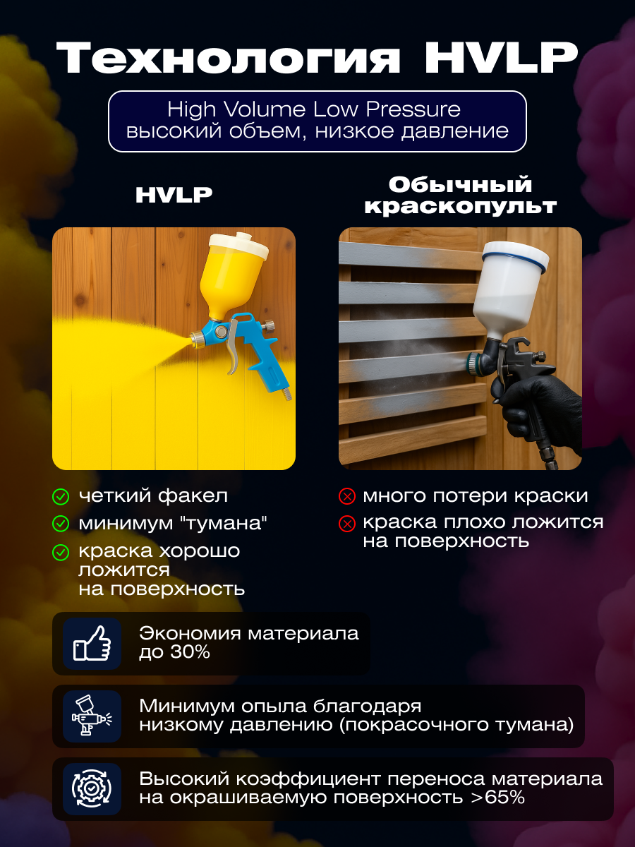 - Тип распыления: HVLP (высокий объем, низкое давление).