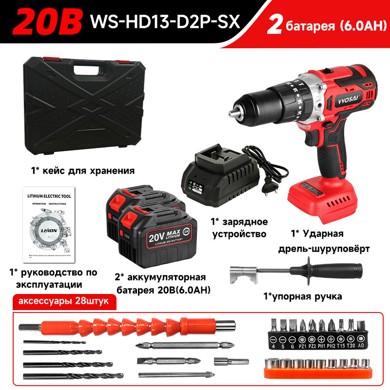 Красная аккумуляторная ударная дрель, бесщеточная, 20 В, 13 мм, 2 аккумулятор 6,0 А·ч,Пластиковый ящик: сравнение цен, характеристики, фото, актуальное наличие и цены.
