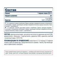 | Дополнительная информация | рекомендации по применению: существуют 2 способа приема креатина: с фазой загрузки: первые 5 дней рекомендуется принимать 1 порцию (5,5 грамм), растворенную в воде или соке, 3-4 раза в день (всего 15-20 грамм в день); затем, на фазе поддержания, принимать 1 порцию (5,5 грамм), растворенную в воде или соке, 1 раз в день; без фазы загрузки: принимать 1 порцию креатина (5,5 грамм), растворенную в соке или воде, 1 раз в день в течение, как минимум, 1 месяца; состав: состав на одну порцию без вкуса (1 мерная ложка - 5,5 грамм): креатин - 5,5 г., креатина моногидрат; состав на одну порцию со вкусом (1 мерная ложка - 5,5 грамм): креатин - 5,27 г., креатина моногидрат, регулятор кислотности лимонная кислота Е330, ароматизатор (в зависимости от вкуса), подсластитель сукралоза Е955, пищевой краситель (в зависимости от вкуса) |