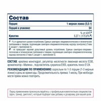 | Дополнительная информация | рекомендации по применению: существуют 2 способа приема креатина: с фазой загрузки: первые 5 дней рекомендуется принимать 1 порцию (5,5 грамм), растворенную в воде или соке, 3-4 раза в день (всего 15-20 грамм в день); затем, на фазе поддержания, принимать 1 порцию (5,5 грамм), растворенную в воде или соке, 1 раз в день; без фазы загрузки: принимать 1 порцию креатина (5,5 грамм), растворенную в соке или воде, 1 раз в день в течение, как минимум, 1 месяца; состав: состав на одну порцию без вкуса (1 мерная ложка - 5,5 грамм): креатин - 5,5 г., креатина моногидрат; состав на одну порцию со вкусом (1 мерная ложка - 5,5 грамм): креатин - 5,27 г., креатина моногидрат, регулятор кислотности лимонная кислота Е330, ароматизатор (в зависимости от вкуса), подсластитель сукралоза Е955, пищевой краситель (в зависимости от вкуса) |