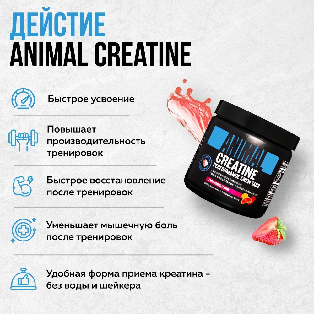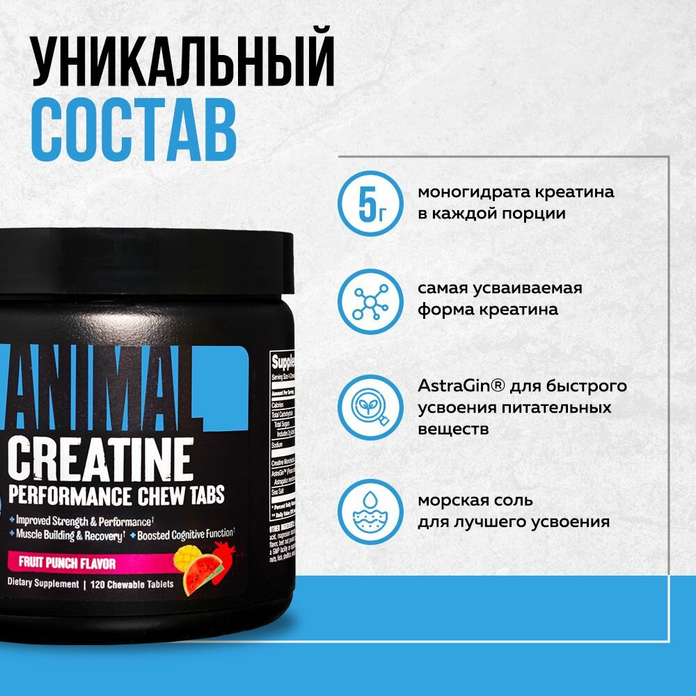 Креатин моногидрат Animal Creatin, спортивное питание, жевательные таблетки со вкусом Фруктовый пунш, 120 шт, 30 порций: сравнение цен, характеристики, фото, актуальное наличие и цены.