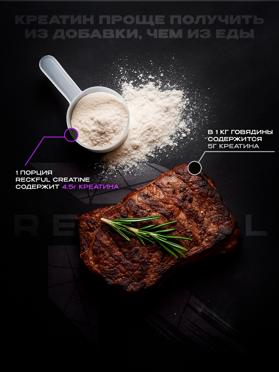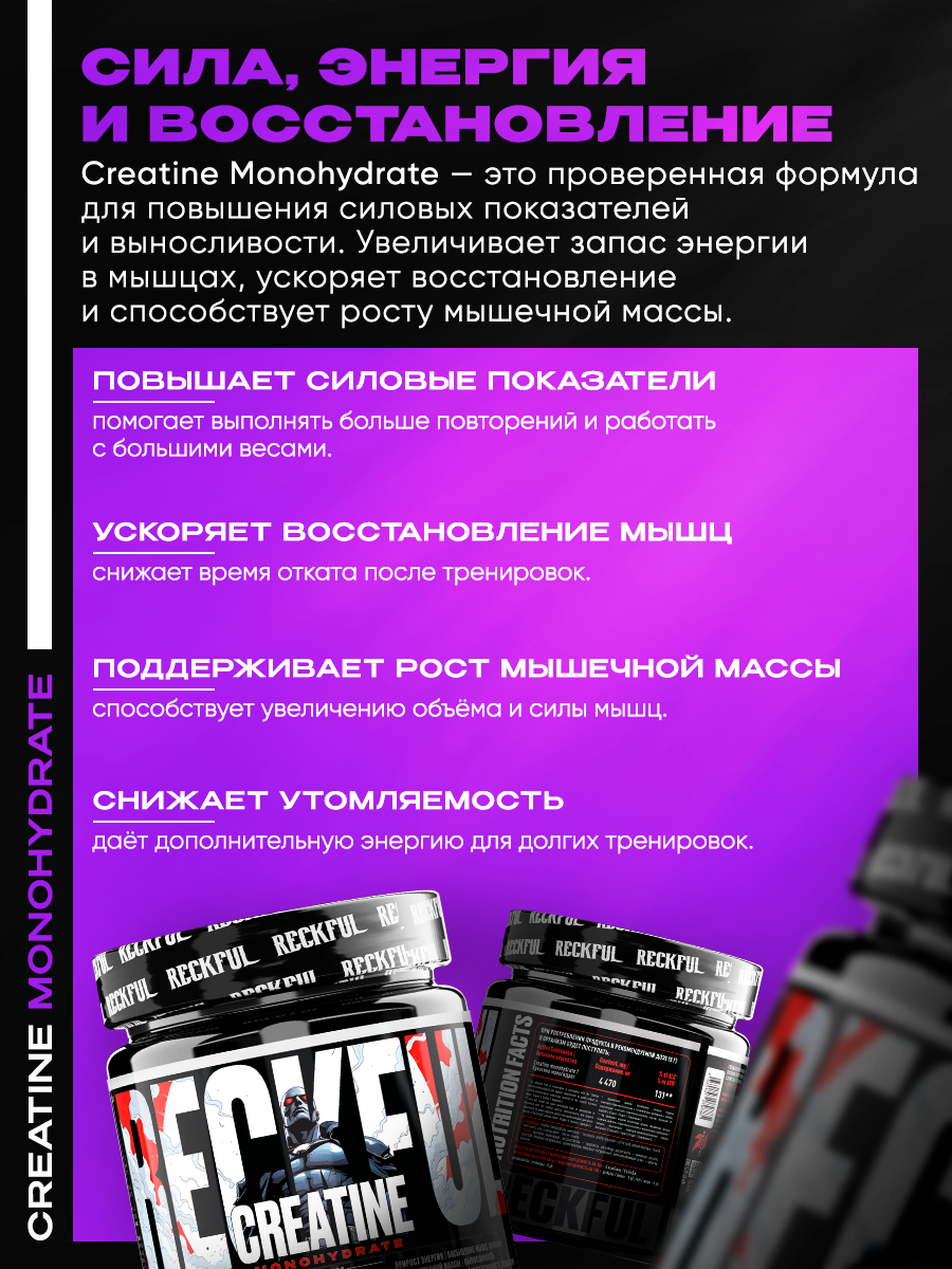 Кроме того, Reckful креатин моногидрат не содержит аспартама, глютена, ГМО, лактозы или мальтодекстрина, что делает его идеальным выбором для людей с аллергиями или другими диетическими ограничениями.