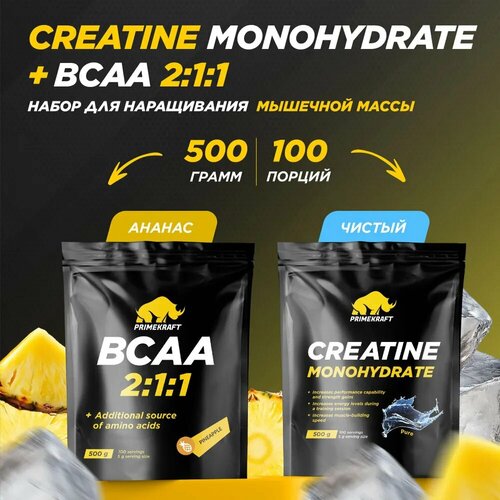Купить Креатин Prime Kraft Creatine Monohydrate + BCAA, ананас, 500 г, 2 дой-пака с доставкой по всей России.