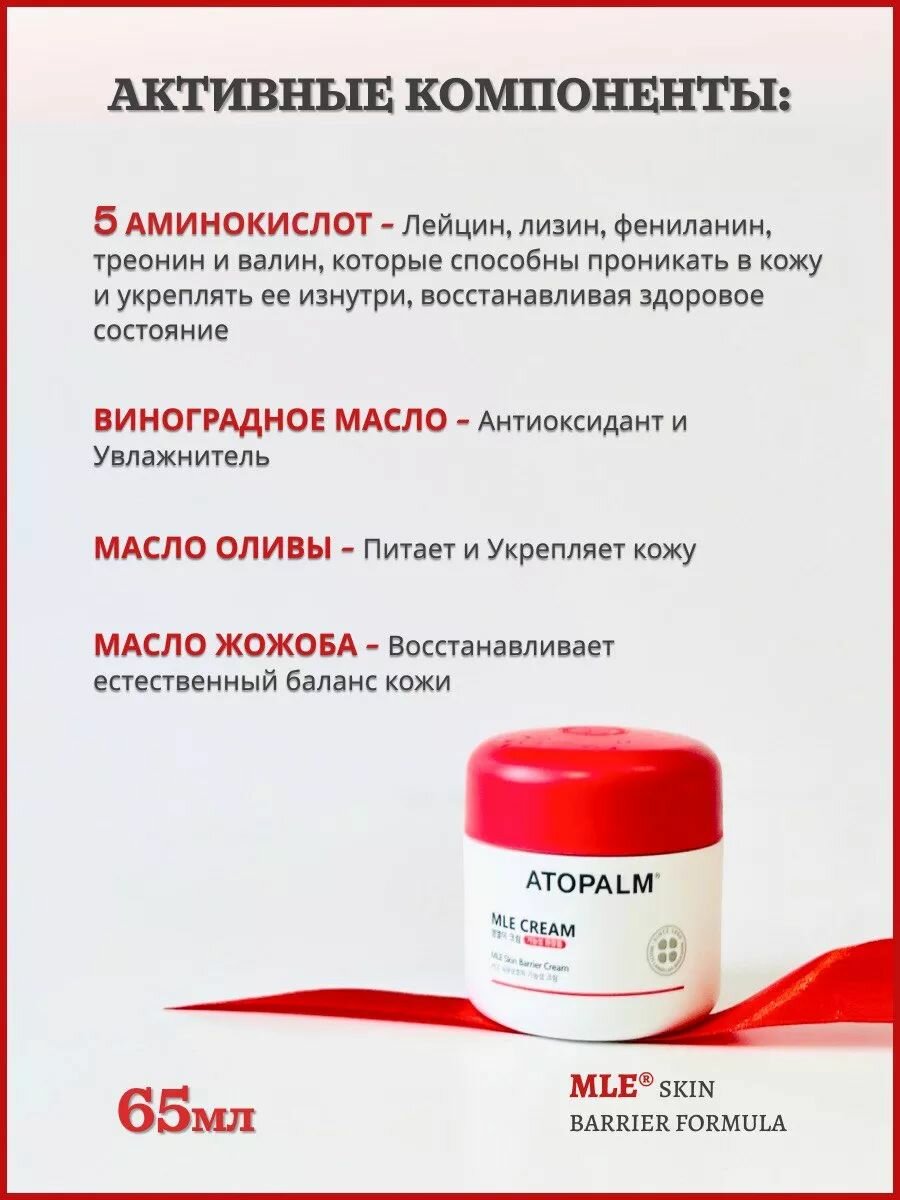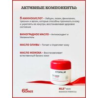 | Активный ингредиент | аллантоин, аминокислоты, антиоксиданты, аргинин, бета-глюкан, витамин B5 (пантотеновая кислота), витамин E, витамины, гиалуроновая кислота, глицерин, жирные кислоты, керамиды, коллаген, комплекс витаминов, лецитин, липиды, мед, минералы, сквалан, стеариновая кислота, церамиды |