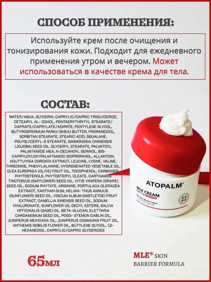 | Состав | Water/Aqua, Glycerin, Caprylic/capric Triglyceride, Cetearyl Alcohol, Pentaerythrityl Stearate/caprate/caprylate/adipate, Pentylene Glycol, Butyrospermum Parkii (Shea) Butter, Propanediol, Sorbitan Stearate, Stearic Acid, Squalane, Polyglyceryl-5 Stearate, Simmondsia Chinensis (Jojoba) Seed Oil, Glyceryl Stearate, Palmitoyl Palmitamide Mea, N-decanoyl Serinol, Bis-capryloyloxypalmitamido Isopropanol, Allantoin, Houttuynia Cordata Extract, Leucine, Lysine, Valine, Threonine, Phenylalanine, Hydrogenated Vegetable Oil, Olea Europaea (Olive) Fruitoil, Tocopherol, Carbomer, Phytosterols, Phytosteryl Oleate, Carthamus Tinctorius (Safflower) Seed Oil, Vitis Vinifera (Grape) Seed Oil, Sodium Phytate, Arginine, Portulaca Oleracea Extract, Xanthan Gum, Helianthus Annuus (sunflower) Seed Oil, Viscum Album (Mistletoe) Fruit Extract, Camellia Sinensis Seed Oil, Sodium Hyaluronate, Sunflower Oil Decyl Esters, Salvia Officinalis (Sage) Oil, Beta-glucan, Elettaria Cardamomum Seed Oil, Pogostemon Cablin Oil, Juniperus Mexicana Oil, Juniperus Communis Fruit Oil, Anthemis Nobilis Flower Oil, Butylene Glycol, 1,2-hexanediol, Caprylic/capric Glycerides |