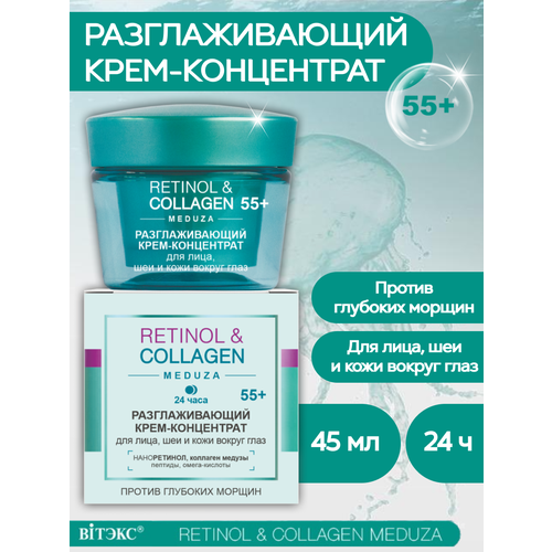Разглаживающий крем-концентрат для лица, шеи и кожи вокруг глаз, 55+, 24 ч 45 мл / против глубоких морщин Насыщенная формула крема из звездных омолаживающих и разглаживающих компонентов комплексно ухаживает за зрелой кожей. Наноретинол стимулирует обновление и регенерацию кожи, восстанавливает упругость и эластичность, эффективно уменьшает глубокие морщины и пигментацию. Коллаген медузы замедляет процессы старения, глубоко увлажняет, уменьшает количество и глубину морщин. Инновационный комплекс из 6 пептидов улучшает синтез собственного коллагена и буквально выталкивает морщинки изнутри. Доказанное* действие: • на 20% уменьшаются гусиные лапки • на 51% сокращаются морщинки под глазами • на 46 % улучшается эластичность кожи • на 67% повышается увлажненность кожи Применение: нанесите утром и/или вечером на очищенную кожу лица и вокруг глаз Состав: вода, цетеариловый спирт, дицетилфосфат, цетет-10 фосфат, сорбитол, дипропилгептилкарбонат, гиалуронат натрия, ППГ-15 стеариловый эфир, ундекан, тридекан, масло Theobroma сacao (какао), циклопентасилоксан, кроссполимер диметикона, гидролизованный коллаген, лецитин, ретинилпальмитат, ксантановая камедь, сквалан, камедь биосахарида-1, пентаэритритилдистеарат, sh-полипептид-1, sh-полипептид-9, sh-полипептид-11, sh-олигопептид-1, sh-олигопептид-2, трипептид-29, фосфат натрия, 1, 2-гександиол, каприлилгликоль, сополимер акрилоилдиметилтаурата аммония и винилпирролидона, глицерин, масло Zea Mays (кукурузы), масло семян Rosa Moschata (мускусной розы), масло семян Helianthus Annuus (подсолнечника), экстракт листьев Rosmarinus Officinalis (розмарина), феноксиэтанол, метилпарабен, этилпарабен, пропилпарабен, цетеарет-25, изопропилмиристат, масло зародышей Triticum vulgare (пшеницы), токоферилацетат, БГТ, парфюмерная композиция, гидроксид натрия, 2-бром-2-нитропропан-1, 3-диол