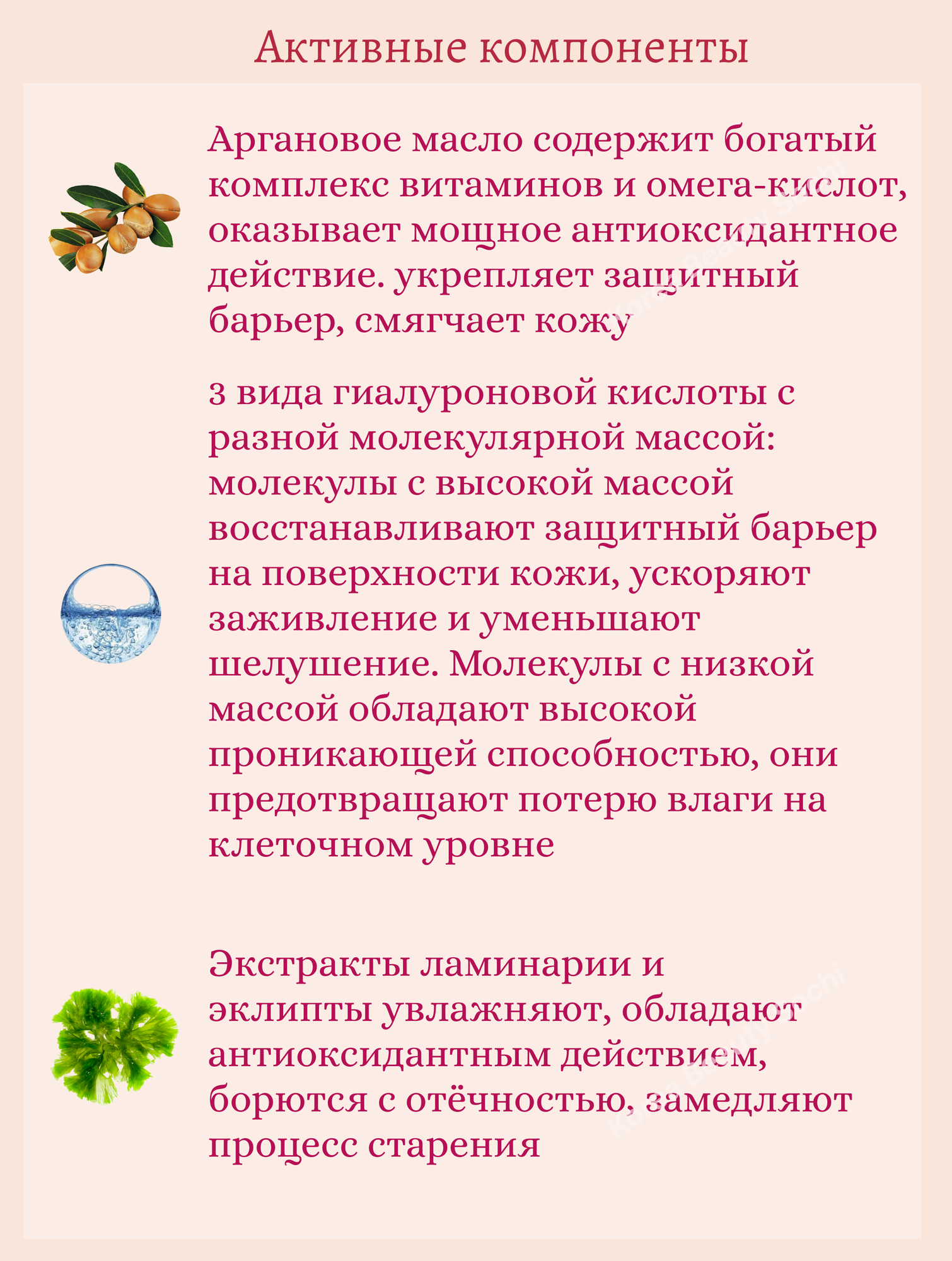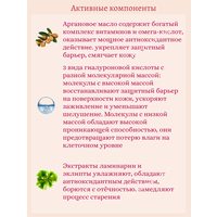 | Масла и экстракты | аргановое масло, масло моринги, масло ши, экстракт брокколи, экстракт виноградной косточки, экстракт икры, экстракт конского каштана, экстракт ламинарии, экстракт овса, экстракт риса, экстракт томата, экстракт хлореллы, экстракт чайного дерева, экстракт черники, экстракт черной икры, экстракт шпината |