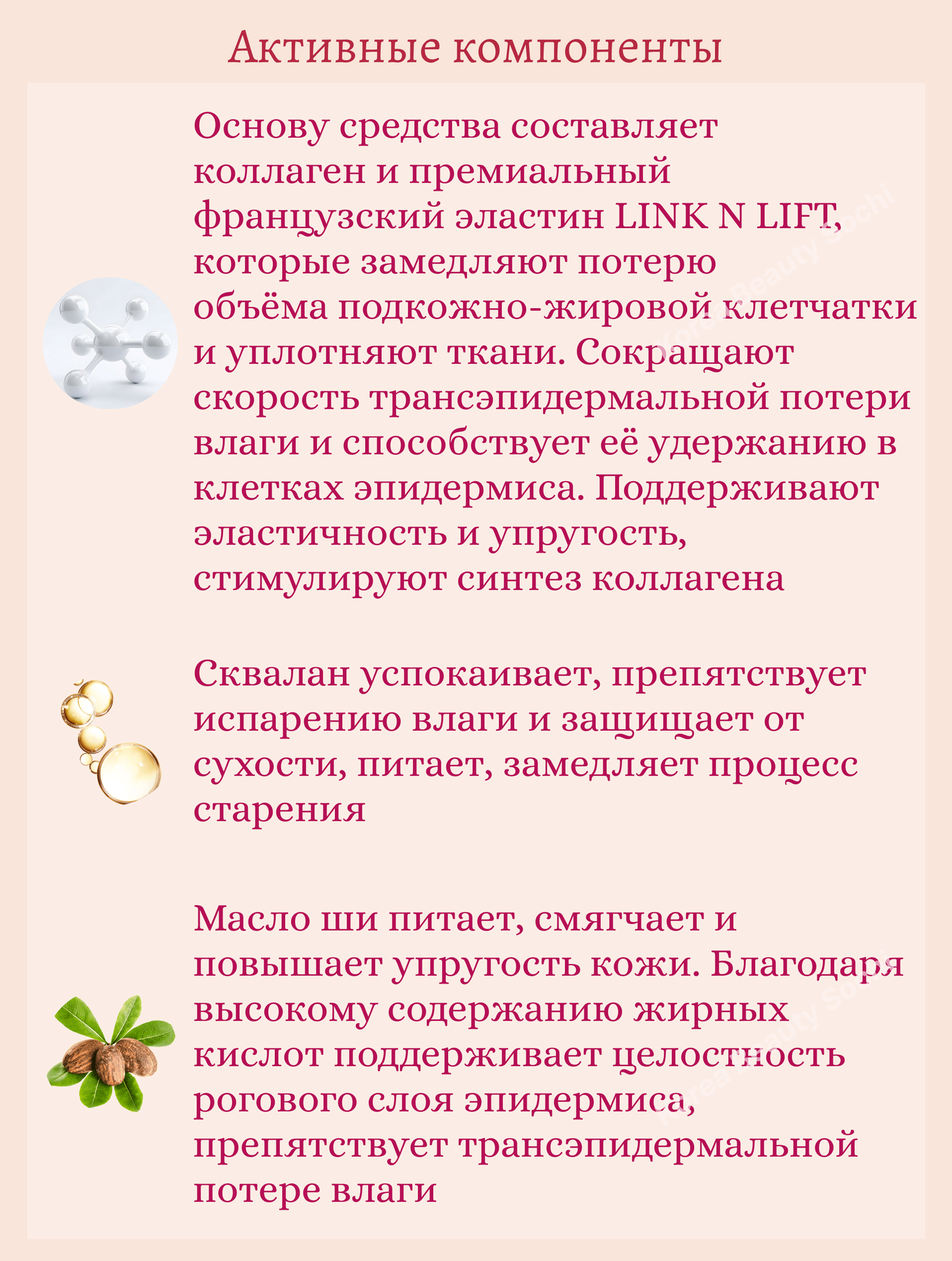 | Активный ингредиент | аденозин, аллантоин, аргинин, бета-глюкан, бетаин, витамин A (ретинол), витамин B3 (ниацинамид), витамин B7 (биотин), витамин C (аскорбиновая кислота), витамин E, витамин P, витамины группы B, гиалуроновая кислота, глутатион, коллаген, пантенол (провитамин B5), пептиды, салициловая кислота, сквалан, церамиды |