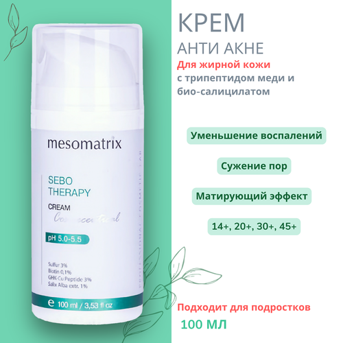 Профессиональный крем для лица от прыщей для подростков и взрослых, для жирной и комбинированной проблемной кожи, с антиакне эффектом Sebo Therapy Mesomatrix. Себорегулирующий и матирующий крем для лица с ниацинамидом, пептидами меди, активной серой и натуральной салициловой кислотой действует как противовоспалительный, выравнивающий, рассасывающий крем от пигментныйх пятен и рубцов постакне. Благодаря всокой концентрации активов крем для лица способствует уменьшению жирного блеска, эффективен для сужения пор, как средство анти акне, против комедонов, черных точек и прыщей. Биодоступная сера регулирует продукцию кожного сала и улучшает его состав. Не пересушивает жирную кожу, не содержит спирта. Профессиональный ламеллярный легкий крем быстро впитывается, не оставляет ощущения липкости, некомедогенный. Подойдет как базовая основа и крем под макияж. Крем для лица Себо Терапи подходит как уход за жирной и комбинированной кожей, склонной к появлению высыпаний, закупорке пор, пигментациям. Регулярное применение средства antiacne от черных точек и угрей поможет устранить сальность и жирный блеск, уменьшит воспаления, восстановит защитные свойства эпидермиса. Сера подавляет активность демодекса, применяется для локальной терапии демодекоза. Результат – чистая, ровная, сияющая, здоровая кожа. Зоны: Крем от прыщей для лица и тела, можно наносить также локально на Т-зону. Важно! Не наносить на кожу век и вокруг глаз. Способ применения: нанести на очищенную кожу и распределить до полного впитывания. Применять 1-2 раза в день утром и вечером. Курс применения 30-90 дней. Противопоказания: очень сухая кожа, индивидуальная непереносимость компонентов. Подходит для взрослой, молодой и подростковой кожи. Подходит для мужского ухода. Флакон с дозатором гарантирует экономичный расход крема и препятствует попаданию микробов при соприкосновении с руками.