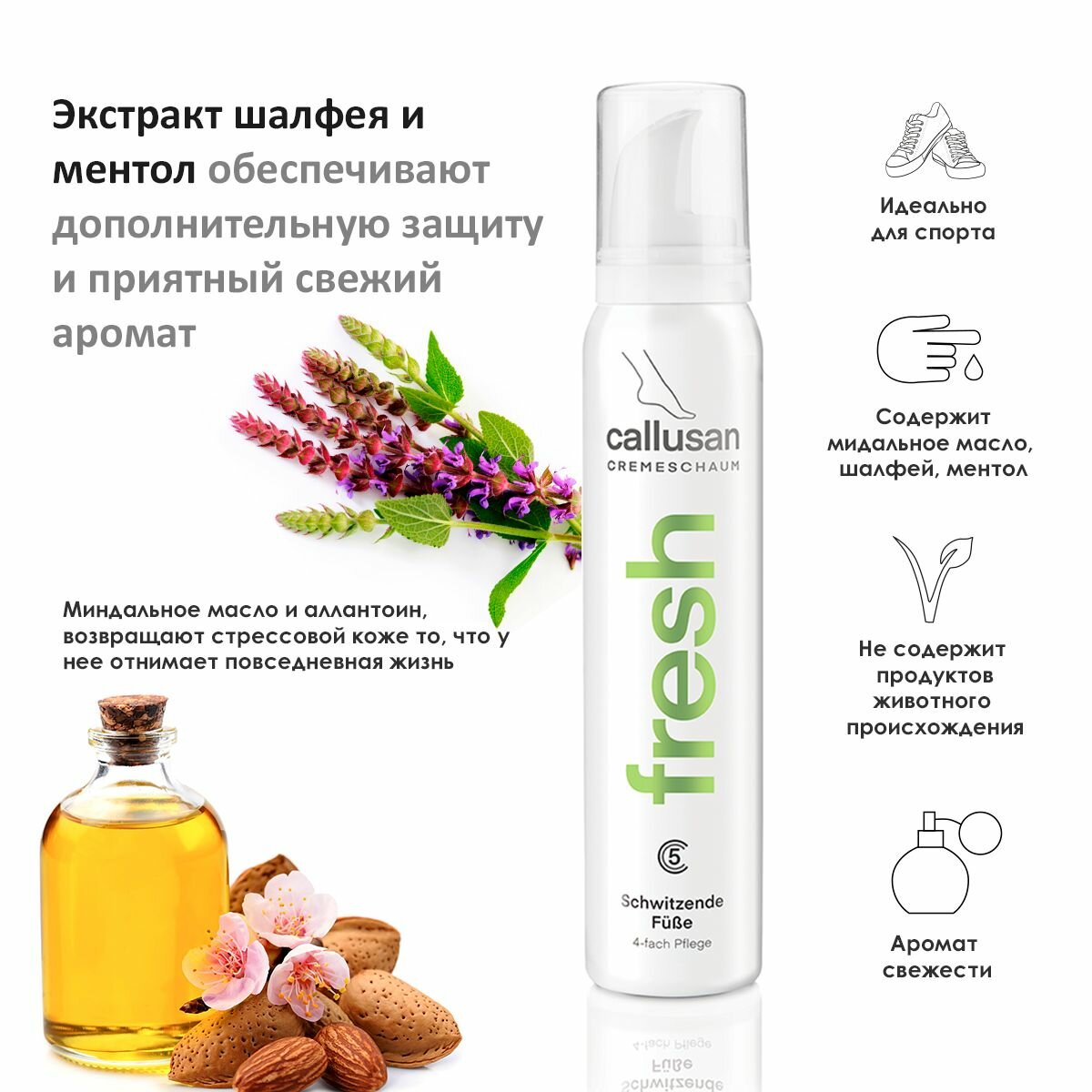 Крем-пенка для ног Callusan Fresh (Каллюзан Фрэш) c 4-х компонентным уходом от потливости ног, 125 мл: сравнение цен, характеристики, фото, актуальное наличие и цены.