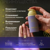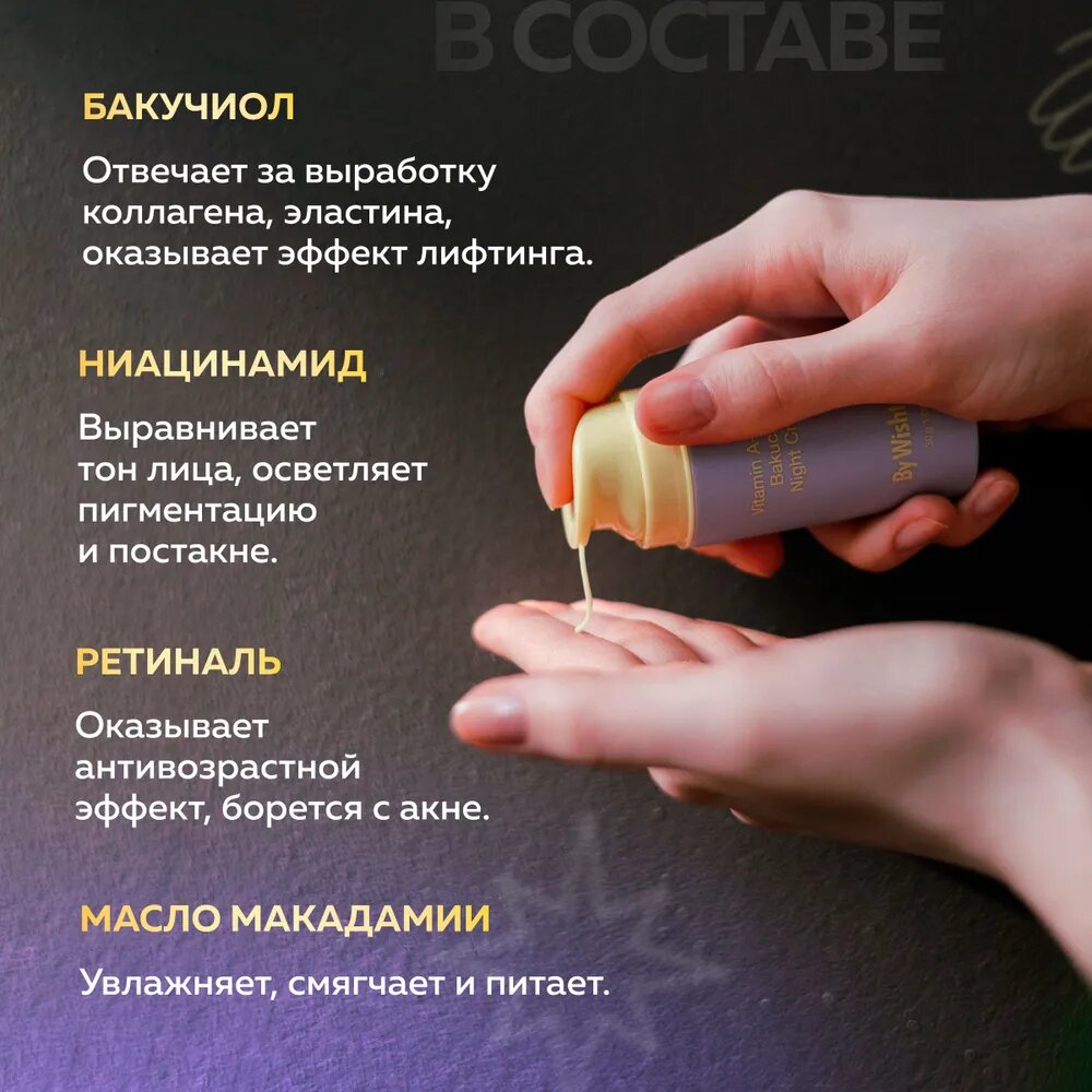 Ночной крем с ретинолом и бакучиолом By Wishtrend Vitamin A-mazing Bakuchiol Night Cream увлажняет, борется с первыми признаками возрастных изменений, стимулирует обновление клеток, разглаживает, улучшает текстуру и состояние кожи. Подходит для чувствительной кожи, не содержит отдушек, красителей и этанола, не нарушает pH-баланс. Рекомендуется использовать в качестве ночного ухода, а при использовании днем — наносить средство с SPF. Характеристики и описание: Цель применения: Уменьшает глубину морщин и предотвращает их появление. Выравнивает микрорельеф. Повышает эластичность. Помогает в борьбе с акне. Увлажняет. Основные ингредиенты и их полезные свойства: 1. Ретинальдегид (300 ppm) или ретиналь — производная форма витамина А. Запускает интенсивный процесс обновления, придает упругость, уплотняет, укрепляет внеклеточный матрикс, нормализует гидролипидный баланс, повышает выработку коллагена, уменьшает выраженность морщин и проявление акне. Действует быстрее и деликатнее других форм витамина A. 2. Бакучиол (10,000 ppm) является растительным аналогом ретинола, стимулирует выработку естественного коллагена в клетках, борется с морщинами, повышает упругость и подавляет выработку меланина, отлично подходит для чувствительной кожи. 3. Ниацинамид (Витамин B3) замедляет доставку меланина к эпидермису, предотвращает образование пигментных пятен. , снижает чувствительность к внешним раздражителям, выравнивает тон, способствует производству коллагена и повышению плотности. 4. Масло макадамского ореха отлично впитывается, увлажняет, смягчает и питает. В состав масла входит более 80% ненасыщенных жирных кислот, похожих на жиры, содержащиеся в нашем эпидермисе. 5. Аденозин — один из самых прогрессивных ингредиентов нового поколения. Эффективно борется с морщинами, оказывая мощное цитопротекторное действие и защищая клетки от окисления, оказывает влияние на синтез проколлагена 1, ответственного за упругость и тонус. 6. Бетаин придает гладкость и мягкость, надолго удерживает влагу, защищает мембраны клеток, устраняет раздражение. Рекомендуется использовать в качестве ночного ухода, а при использовании днем — наносить средство с SPF. Если у вас чувствительная кожа или вы раньше не использовали продукты с ретинолом, вводите крем в уход постепенно (например, используйте средство 2 раза в неделю на протяжении 2 недель, затем, если на коже не появляются признаки раздражения, наносите крем 3 раза в неделю на протяжении 2 недель). Форма выпуска: Яркий флакон с дозатором и колпачком. Вес продукта - 30г. Комплектация: Крем для лица, 30 грамм, 1 штука. Область использования: Лицо. Срок годности в днях: См. на упаковке. Состав: Aqua(Water), Glycerin, Hydrogenated Polydecene, Caprylic/Capric Triglyceride, Betaine, Phenyl Trimethicone, Polyglyceryl-3 Methylglucose Distearate, Cetyl Alcohol, Macadamia Integrifolia Seed Oil, Niacinamide, Glyceryl Glucoside, Glyceryl Stearate, Bakuchiol, Trehalose, Behenyl Alcohol, Pentaerythrityl Distearate, 1,2-Hexanediol, Polyglyceryl-10 Laurate, Ammonium Acryloyldimethyltaurate/VP Copolymer, Dipropylene Glycol, Hydroxyacetophenone, Laminaria Japonica Extract, Eclipta Prostrata Leaf Extract, Sodium Stearoyl Glutamate, Ethylhexylglycerin, Adenosine, Glucose, Fructooligosaccharides, Butylene Glycol, Sodium Hyaluronate, Retinal, Hydrogenated Lecithin, Beta-Glucan, Hydrolyzed Hyaluronic Acid, Centella Asiatica Extract, Ficus Carica (Fig) Fruit Extract, Ceramide NP, Tocopherol, Collagen, Leuconostoc/Radish Root Ferment Filtrate, Palmitoyl Tripeptide-8, Dextran. Способ применения: Нанесите средство на сухое лицо после очищения, тонизации и использования сыворотки. Рекомендуется использовать в качестве ночного ухода, а при использовании днем — нан