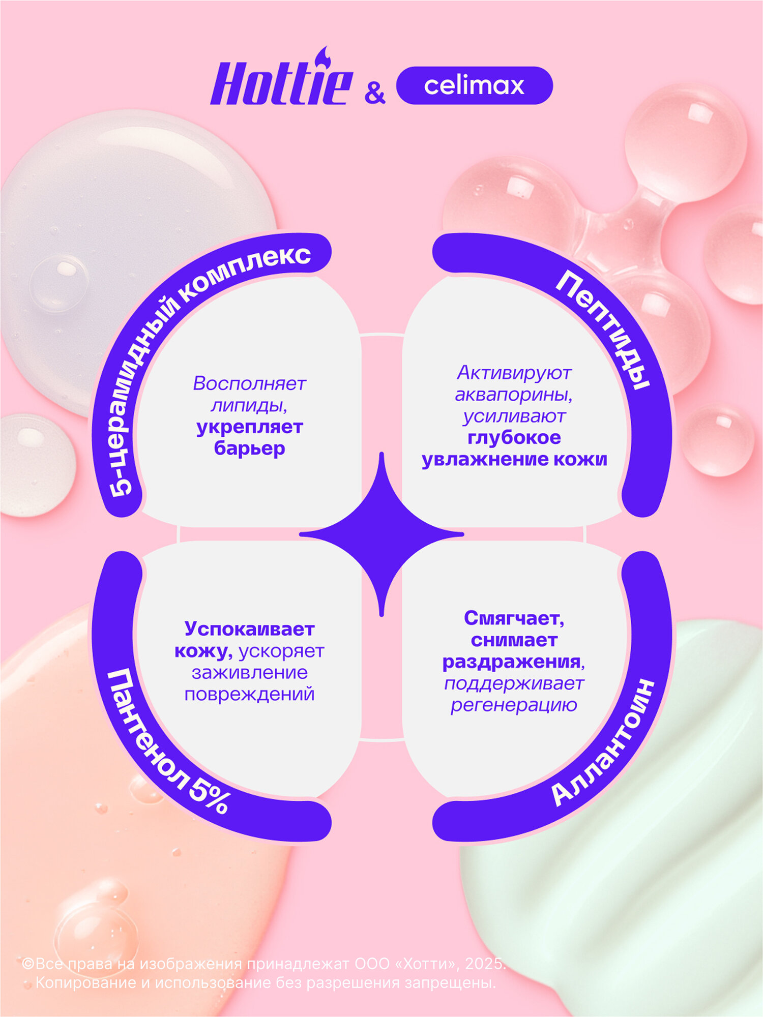 | Активный ингредиент | AHA-кислоты, D-пантенол, PHA-кислоты, ВНА-кислоты, аденозин, аллантоин, аминокислоты, антиоксиданты, арбутин, аргинин, бакучиол, бета-глюкан, бетаин, бисаболол, витамин A (ретинол), витамин B3 (ниацинамид), витамин B5 (пантотеновая кислота), витамин C (аскорбиновая кислота), витамин E, витамины, витамины группы B, гиалуроновая кислота, глицерин, глицин, глутатион, жирные кислоты, камфора, керамиды, коллаген, комплекс витаминов, кофеин, лактобионовая кислота, лецитин, лизин, липиды, мадекассосид, минералы, мочевина, муцин улитки, олеиновая кислота, пантенол (провитамин B5), пептиды, пребиотики, протеины, ресвератрол, салициловая кислота, сквалан, сок нони, спирт, стеариновая кислота, тирозин, транексамовая кислота, феруловая кислота, центелла азиатская, церамиды, цинк |
